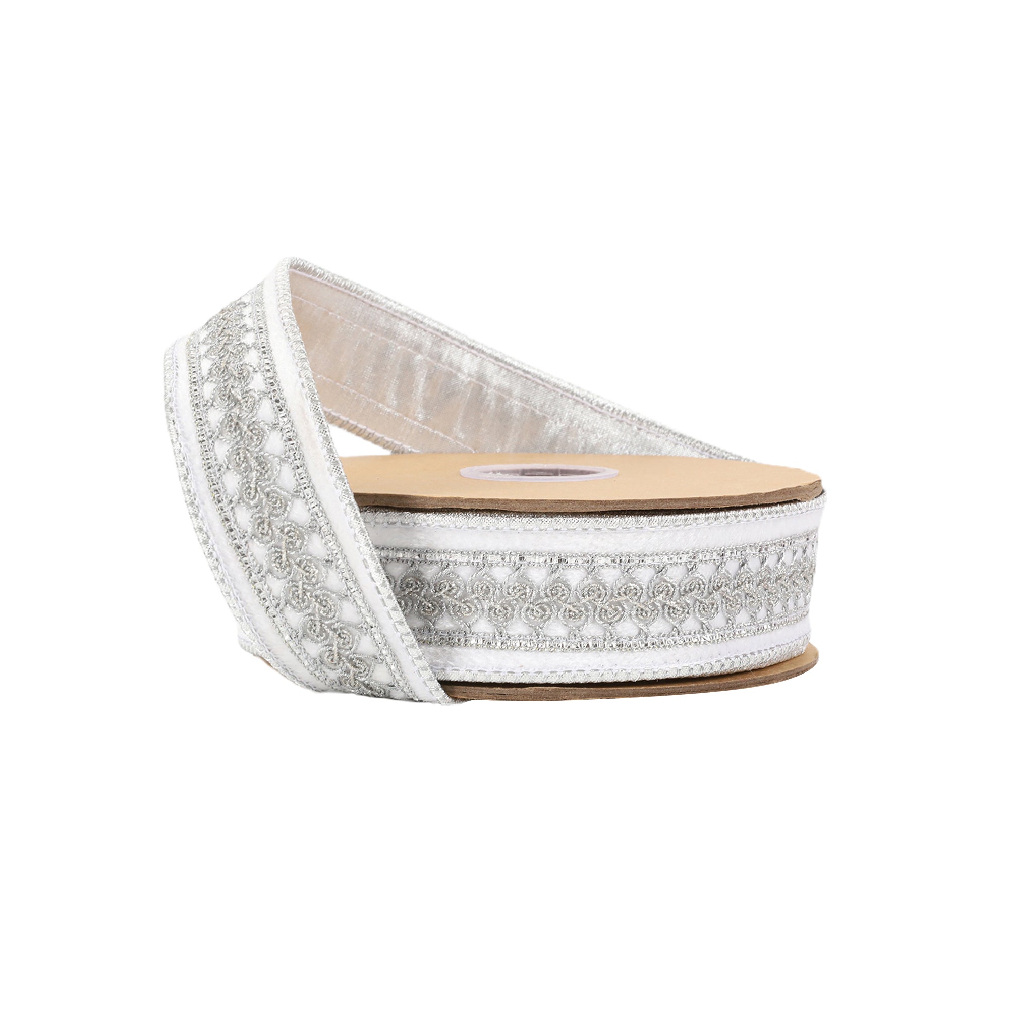 1 1/2" Double-Fused Wired Velvet Ribbon w/ Metallic Trim | White/Silver | 10 Yard Roll