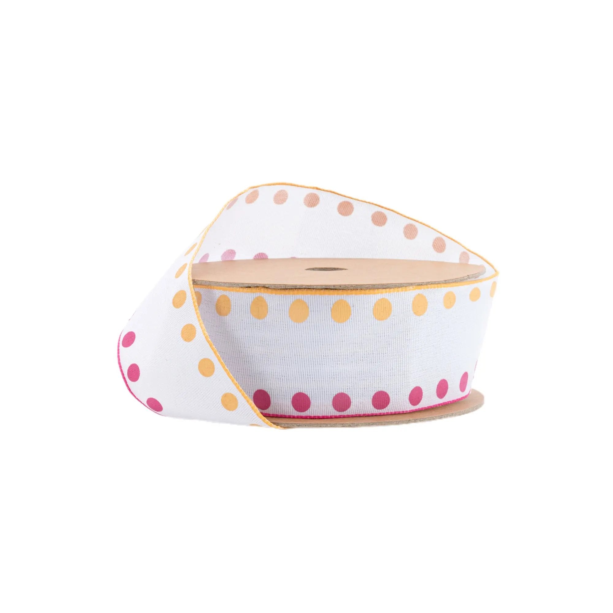 • Playful Design: This 1 1/2" wired ribbon features a fun candy dot pattern in hot pink and orange on a crisp white background, perfect for lively decorations.