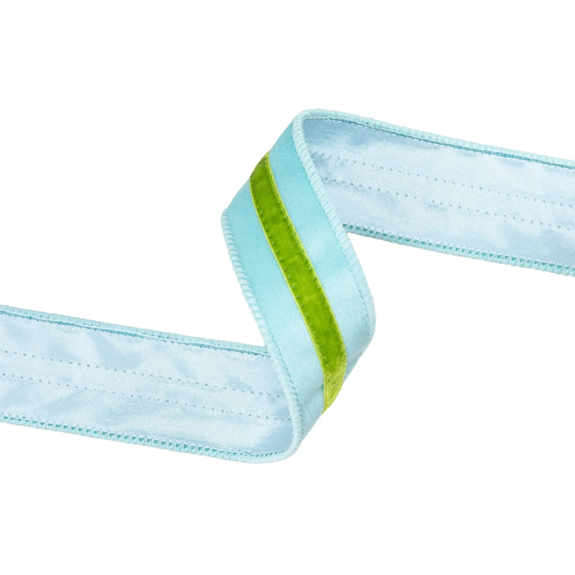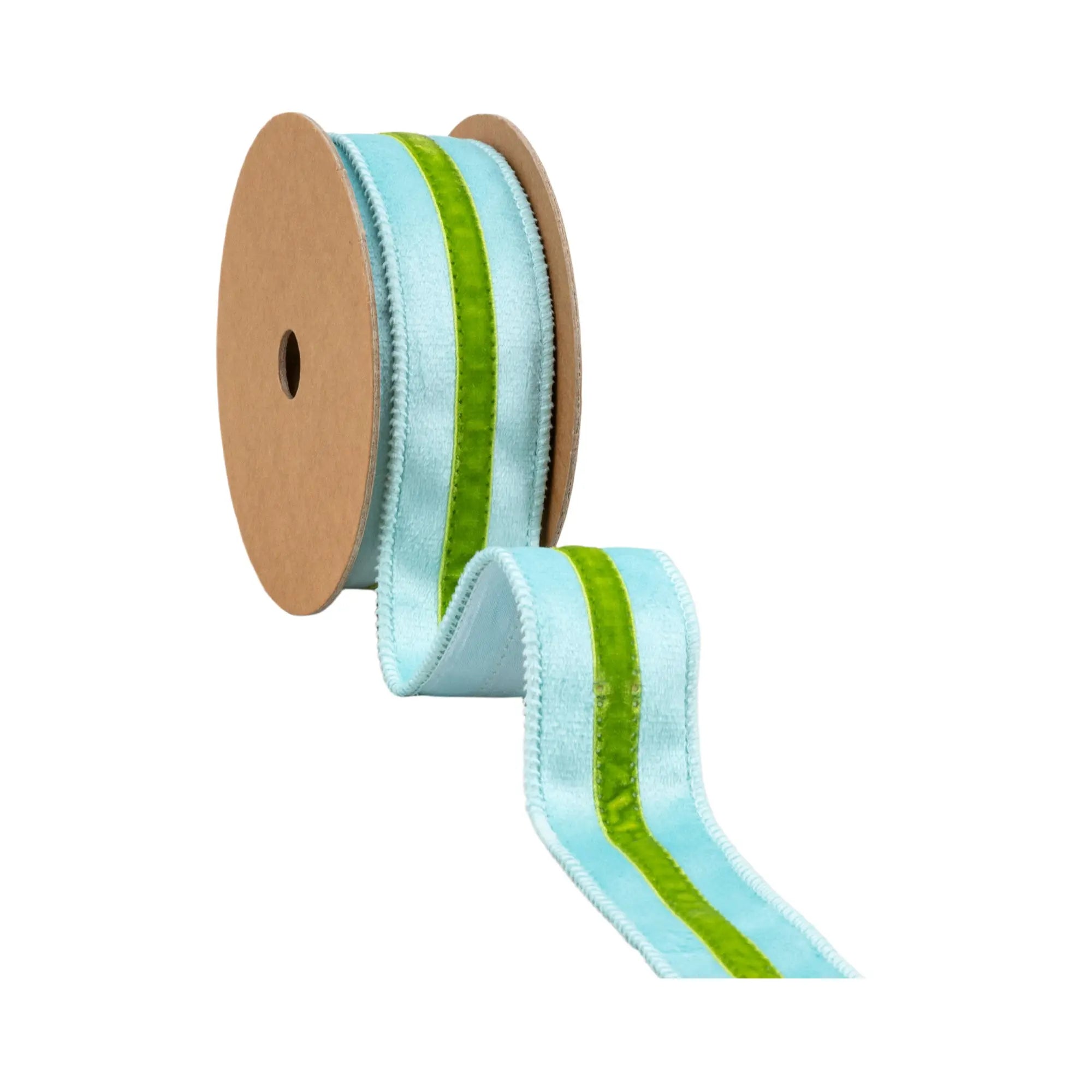 1 1/2" Wired Velvet Ribbon w/ Trim | Blue w/ Green Trim | 10 Yard Roll