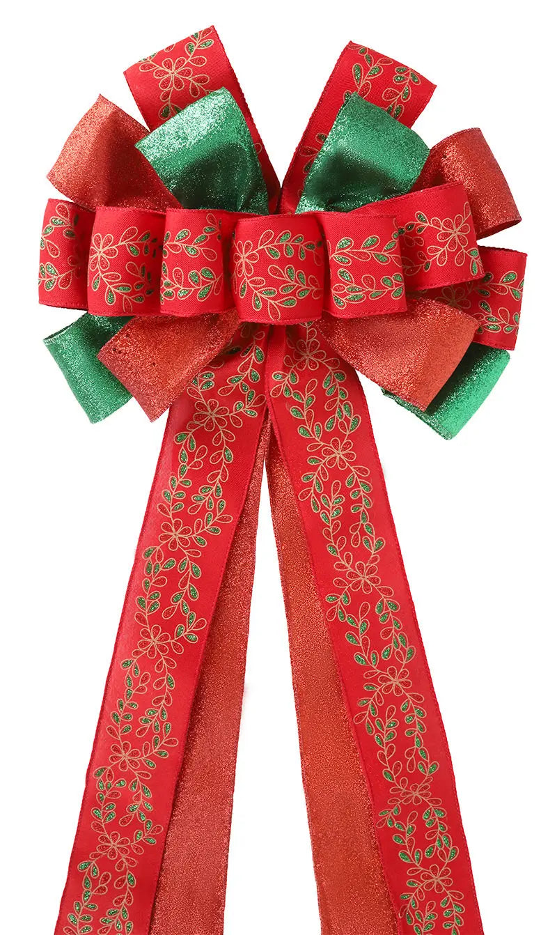 13" Decorative Christmas Tree Topper Bow (2.5" Wired Ribbon) | Red/Green Glitter Printed Floral