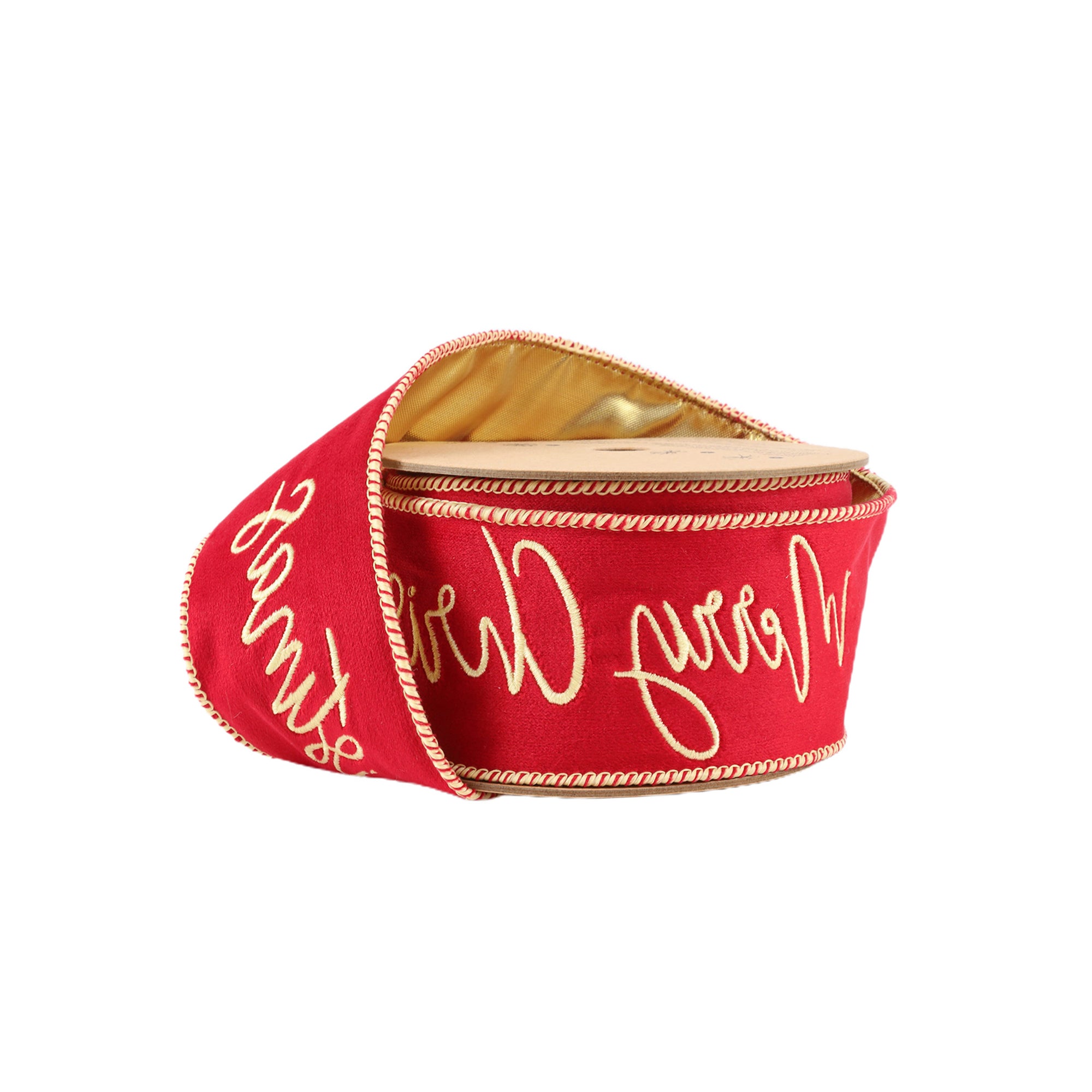 • Luxurious Festive Touch: Elevate your holiday decor with our 2 1/2" Embroidery Velvet ribbon in vibrant red, adorned with "Merry Christmas" script and a shimmering gold backing.