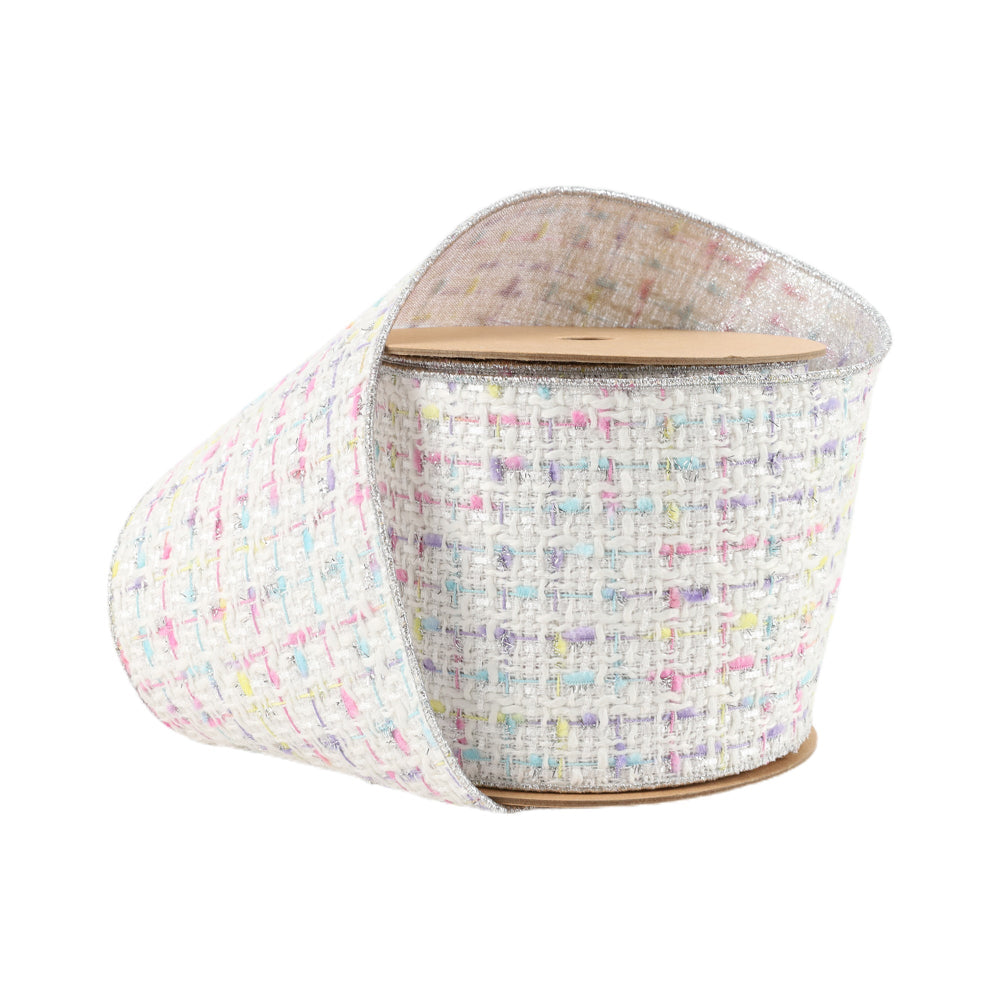 4" Wired Ribbon | Tweed White w/ Silver Backing | 10 Yard Roll