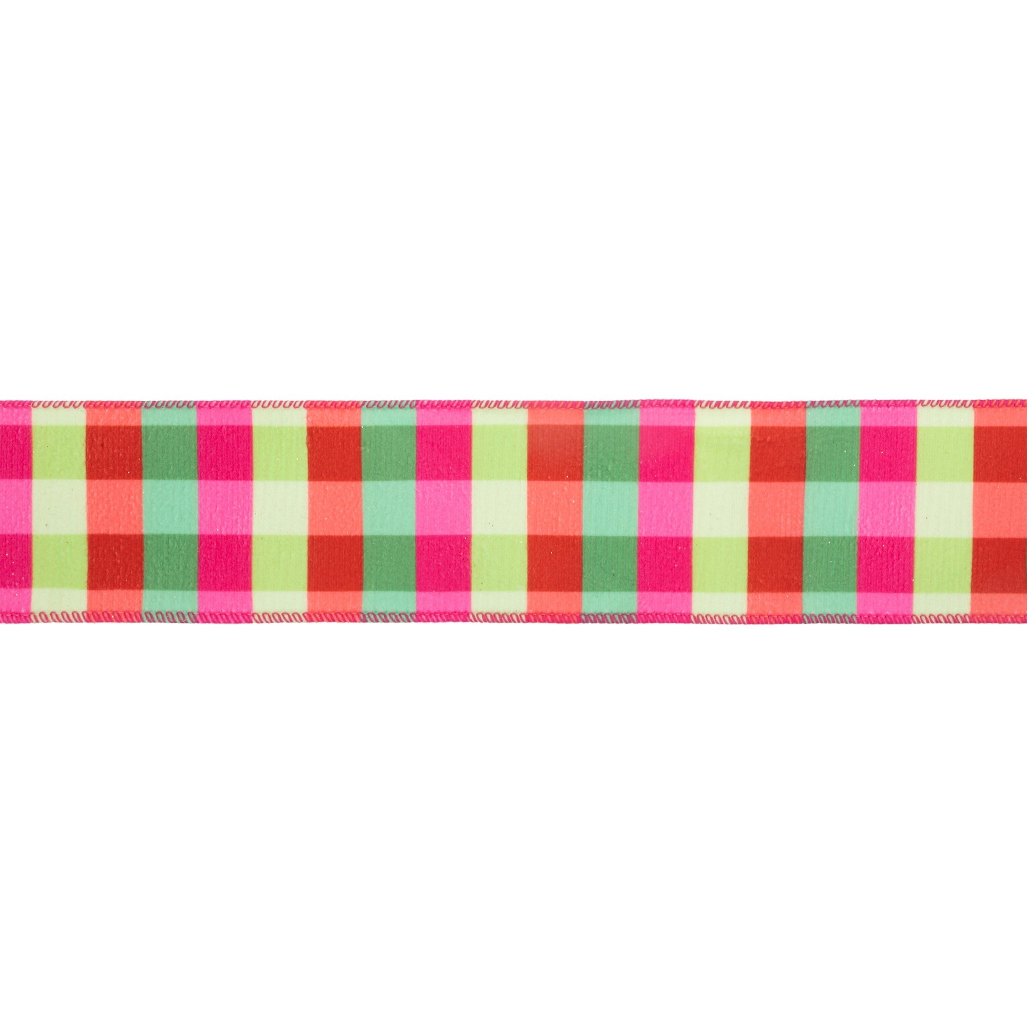 • Vibrant & Bold Design This 2 1/2" velvet ribbon features a striking fluorescent pink and green plaid pattern for eye-catching decor.
