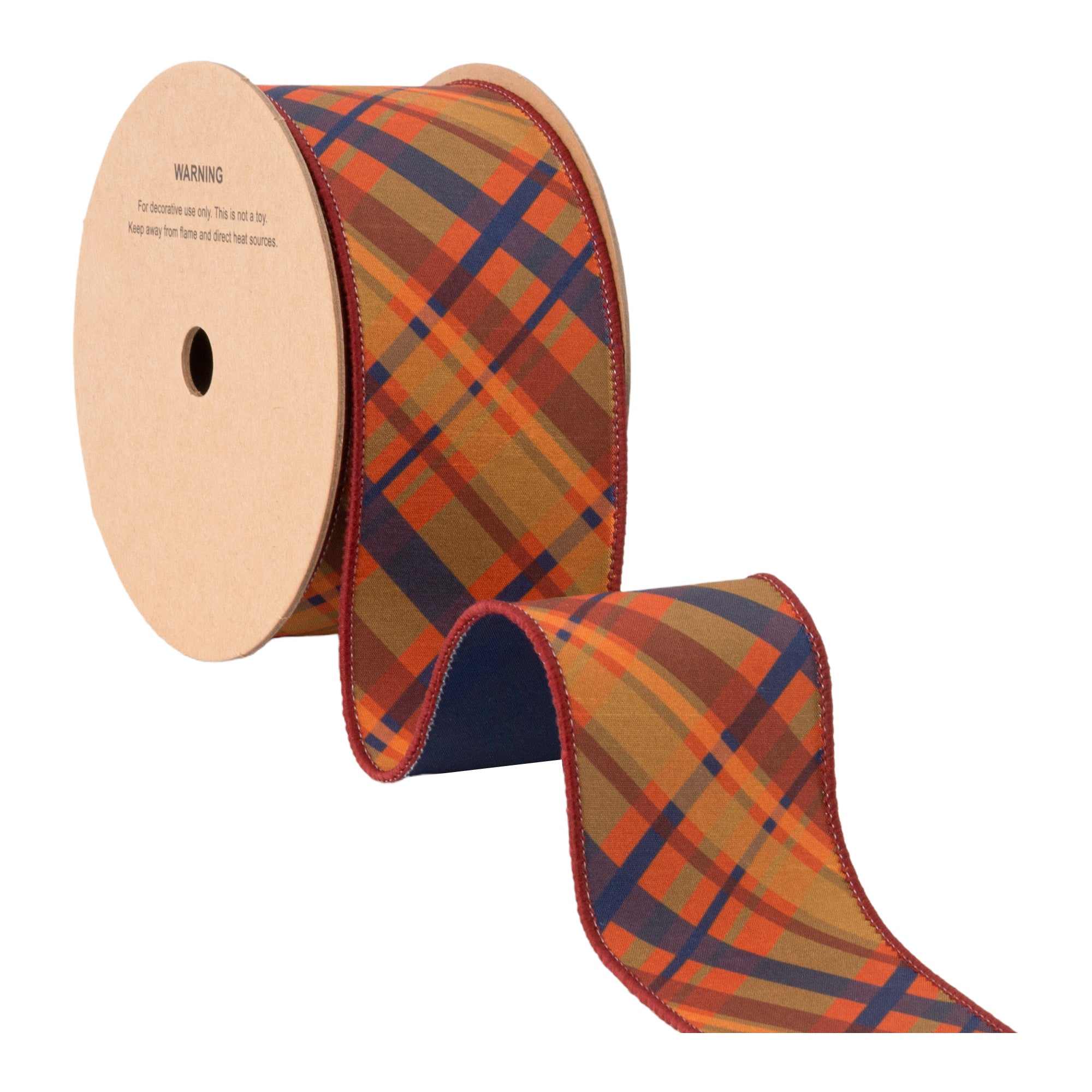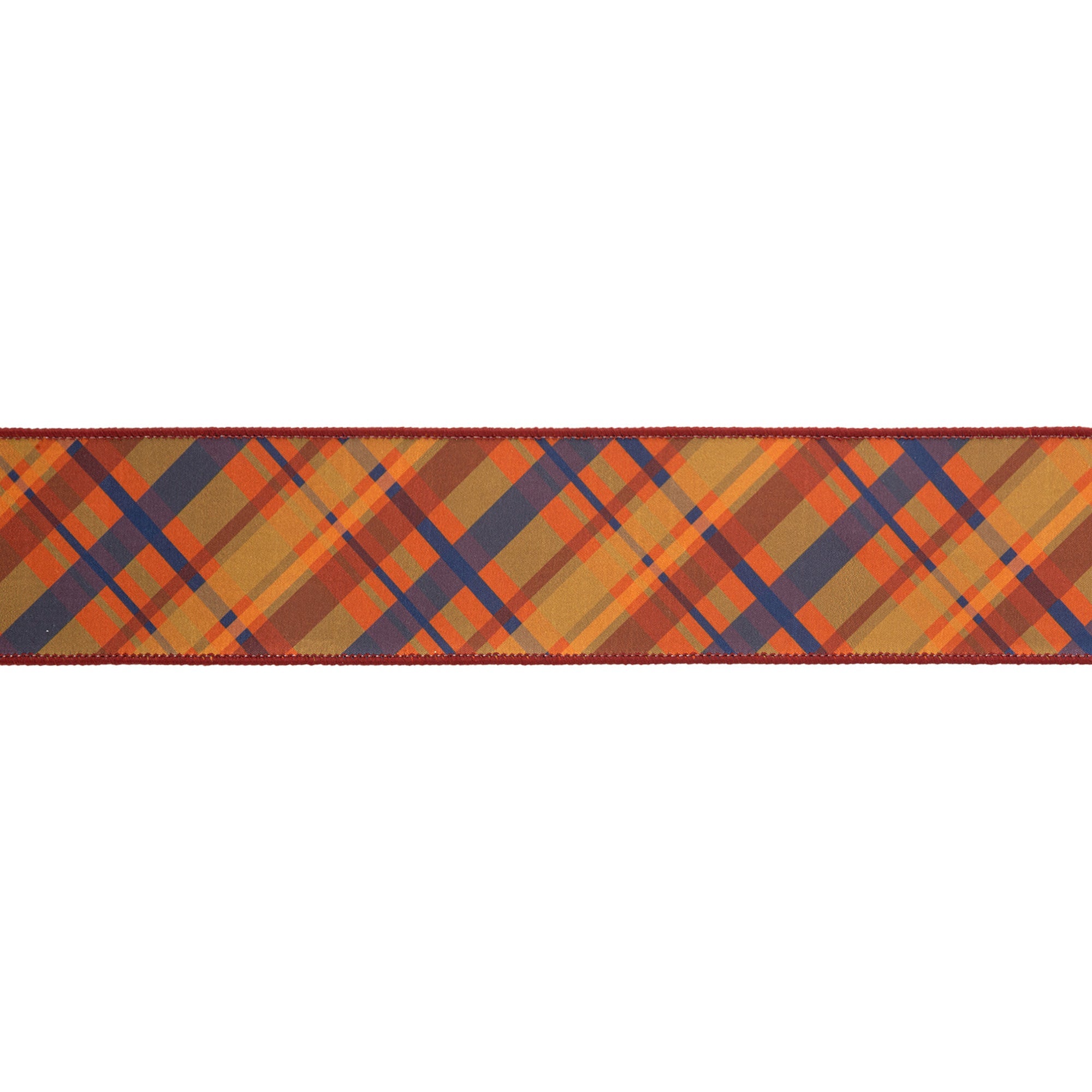 2 1/2" Wired Dupioni | Fall Bais Plaid Blue/Orange with Blue Backing | 10 Yard Spool