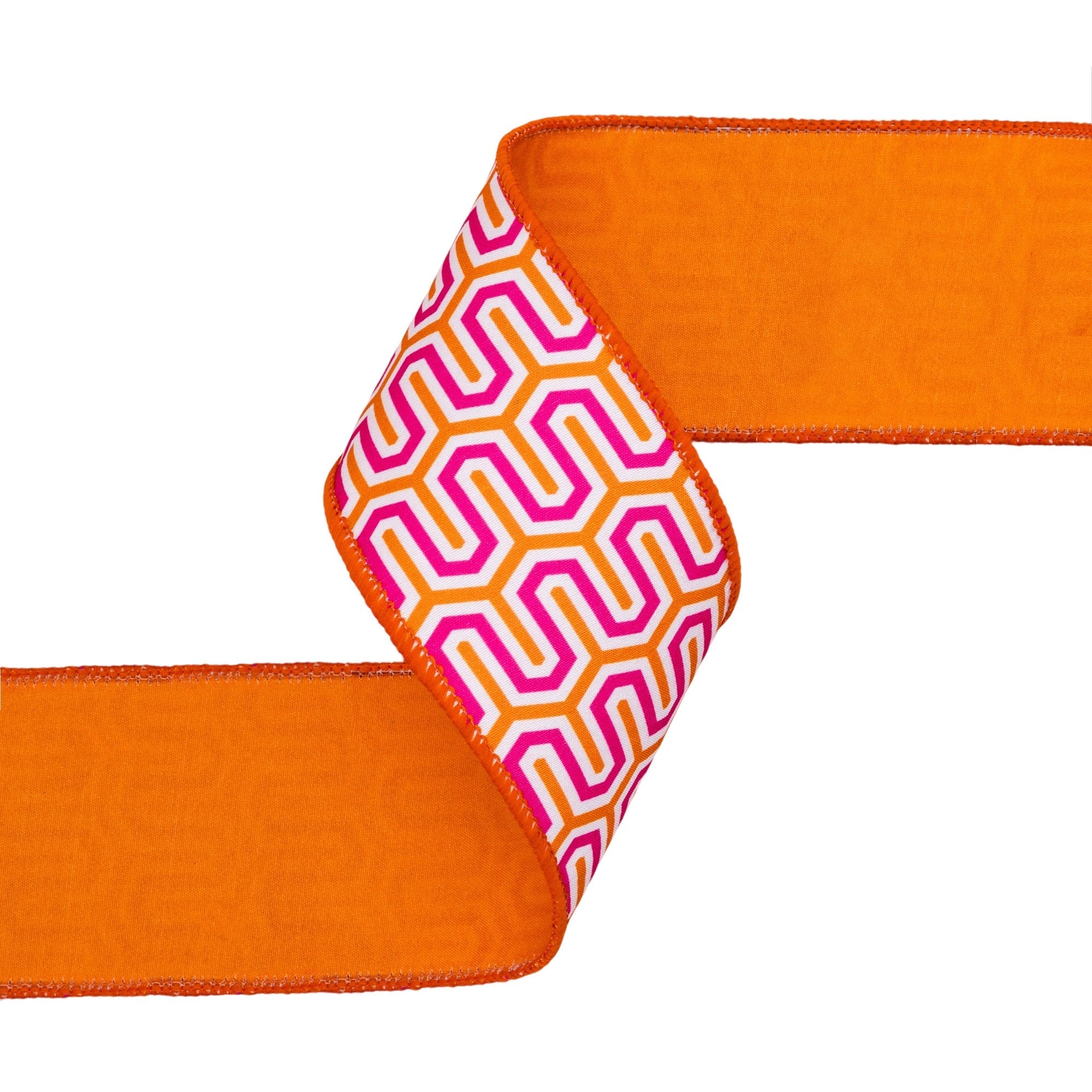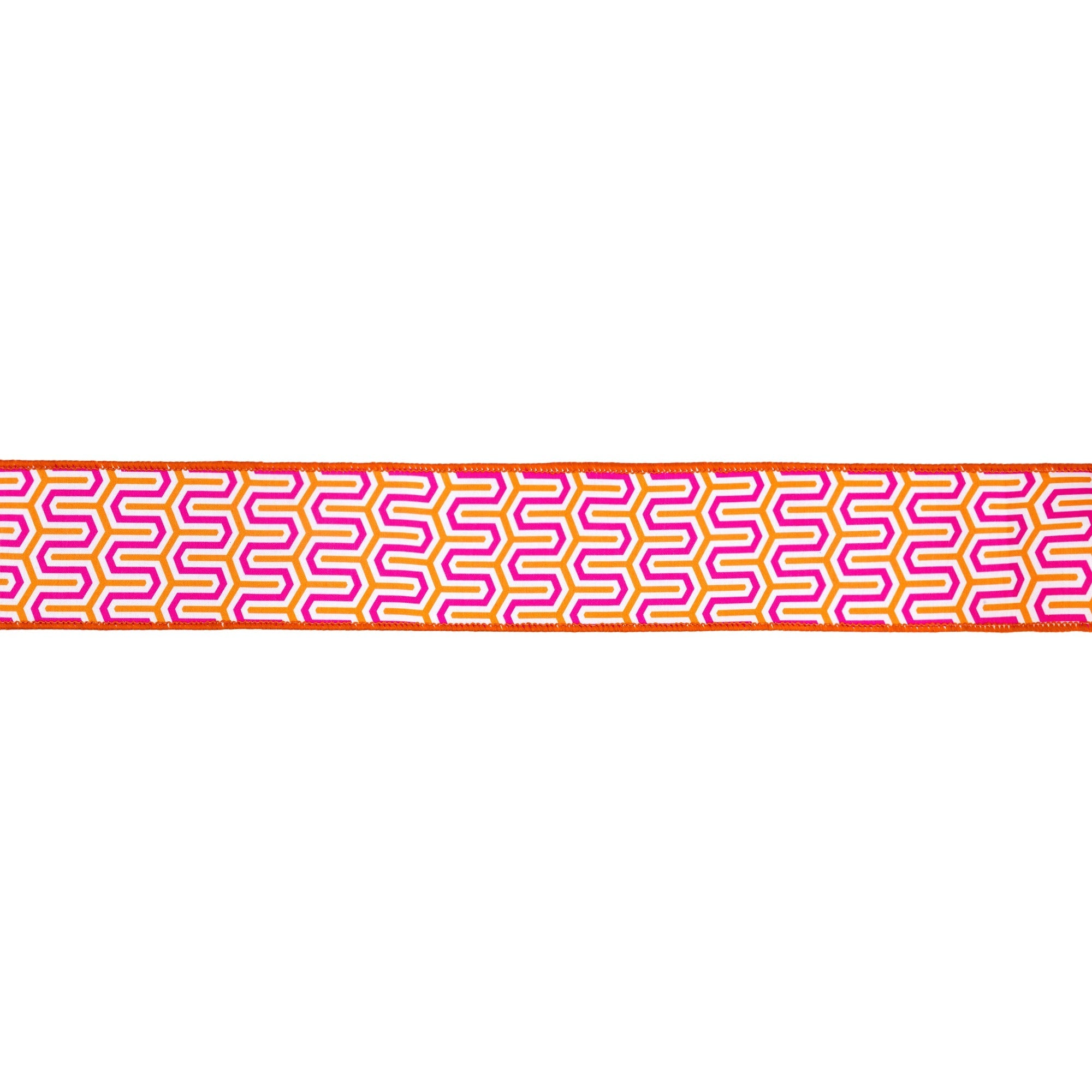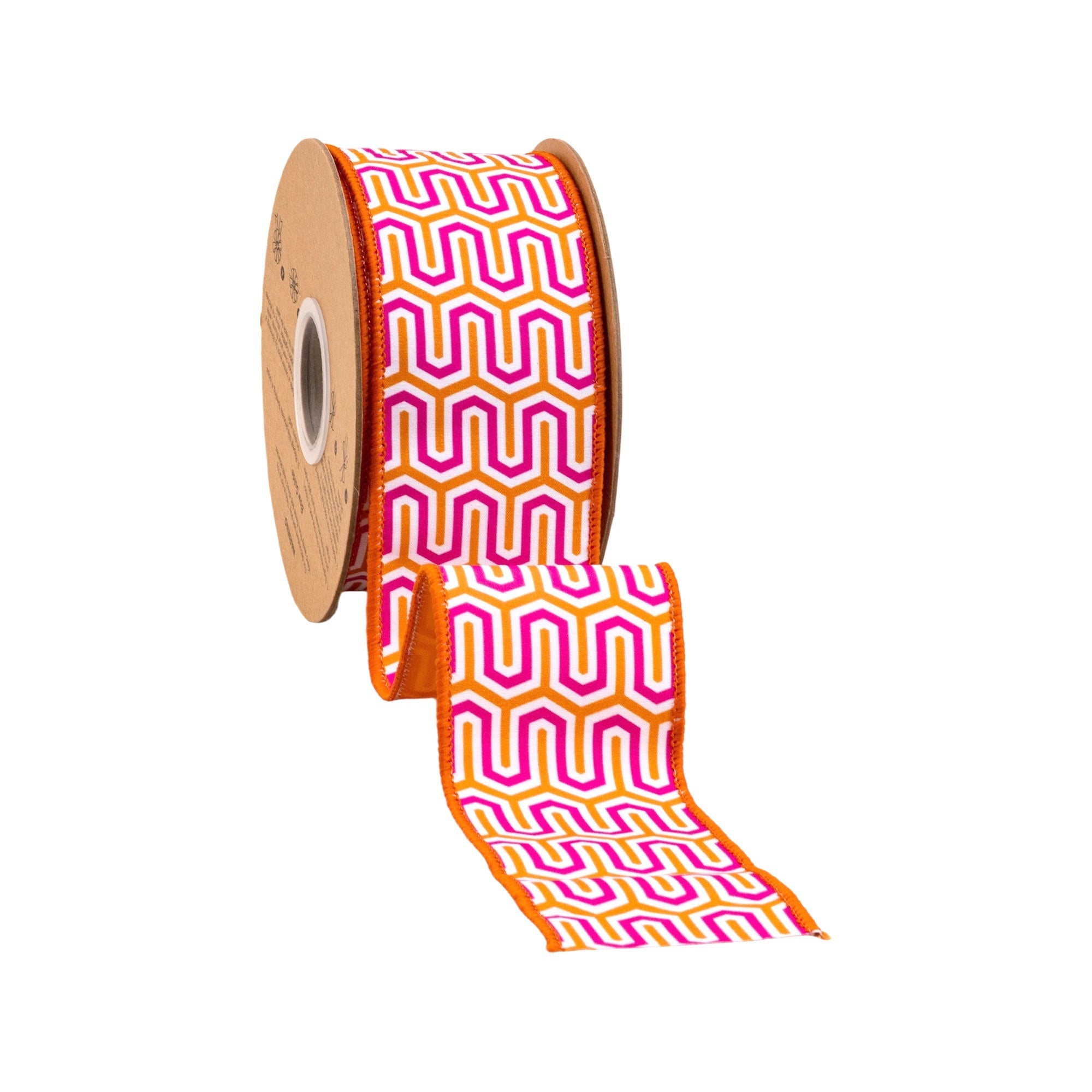 2 1/2" Wired Dupioni Ribbon| Pink/Orange/White Geometric w/ Orange Backing | 10 Yard Roll