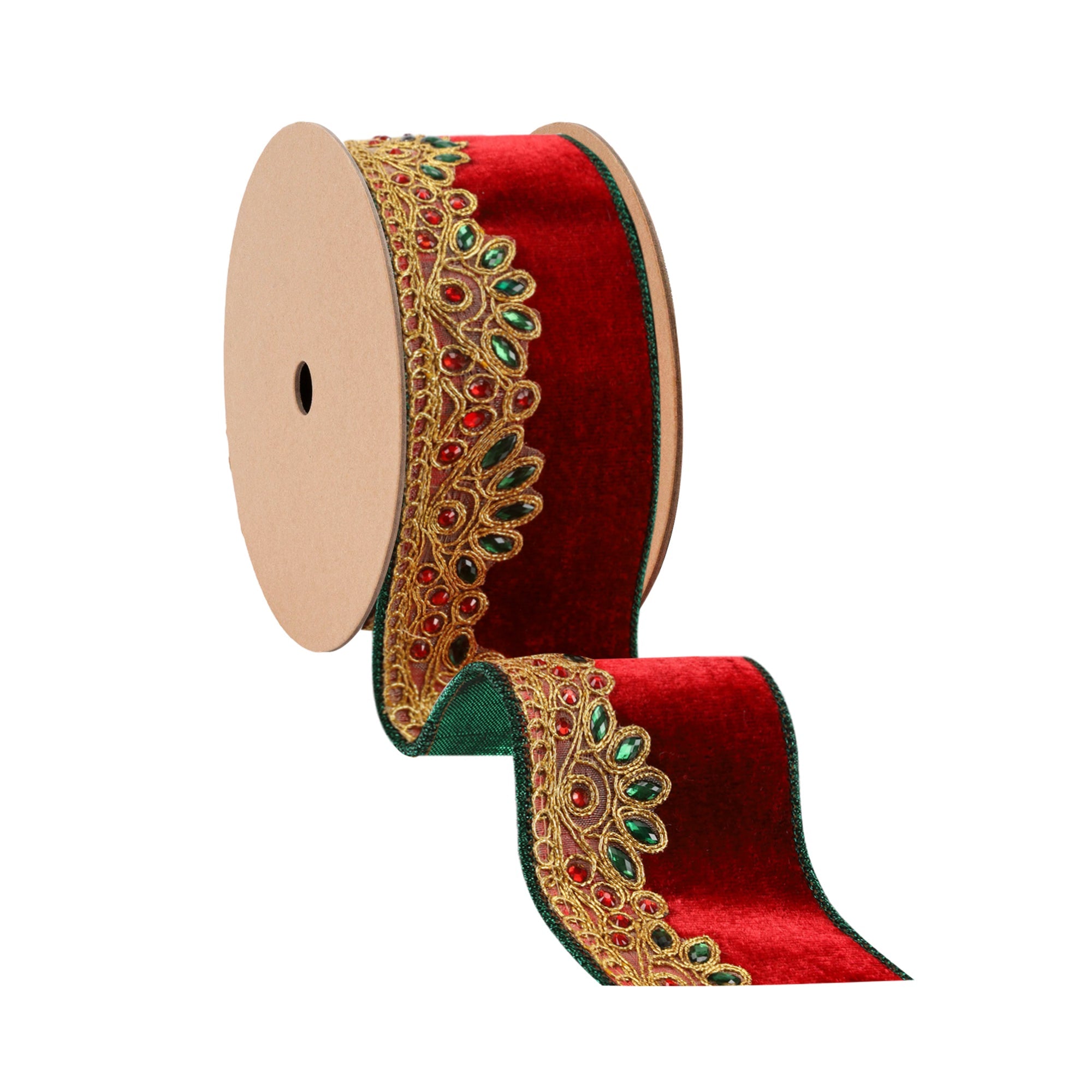 2 1/2 Wired Premium Velvet Ribbon | Gold Scallop Jewel Trim | 5 Yard Roll