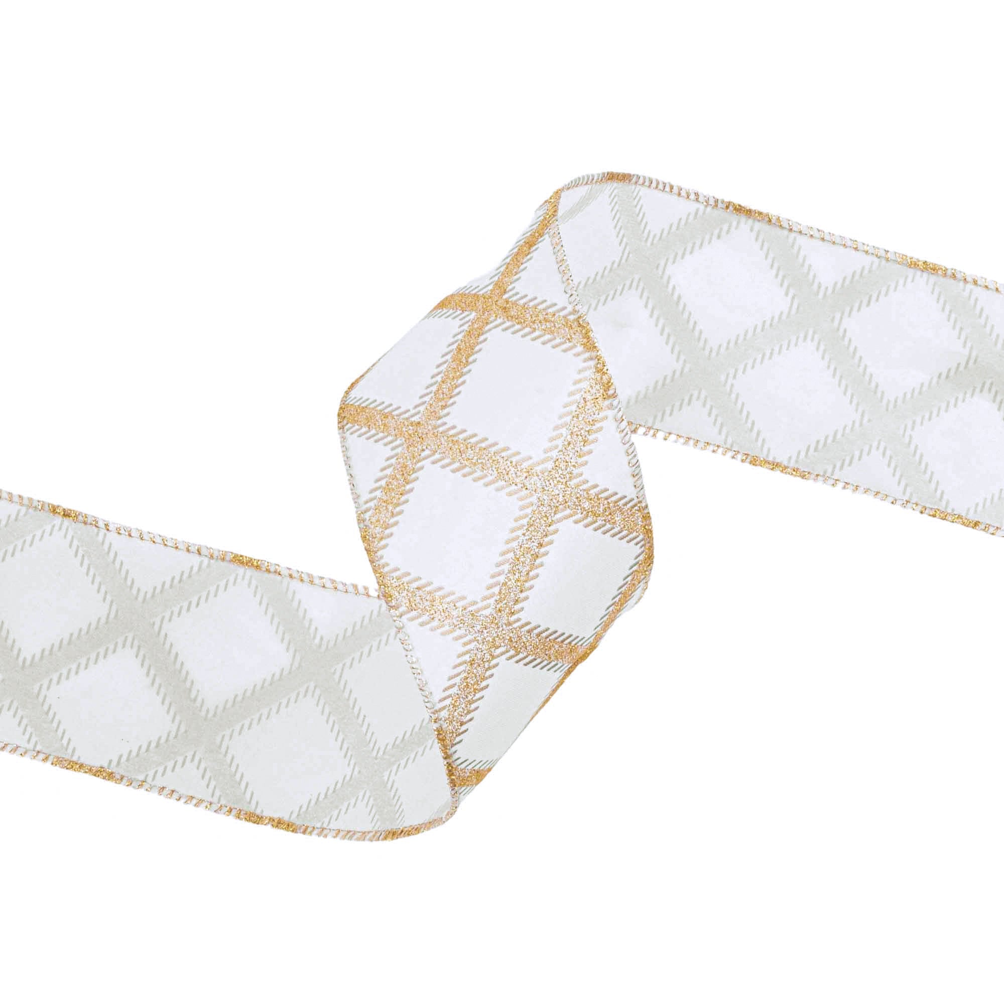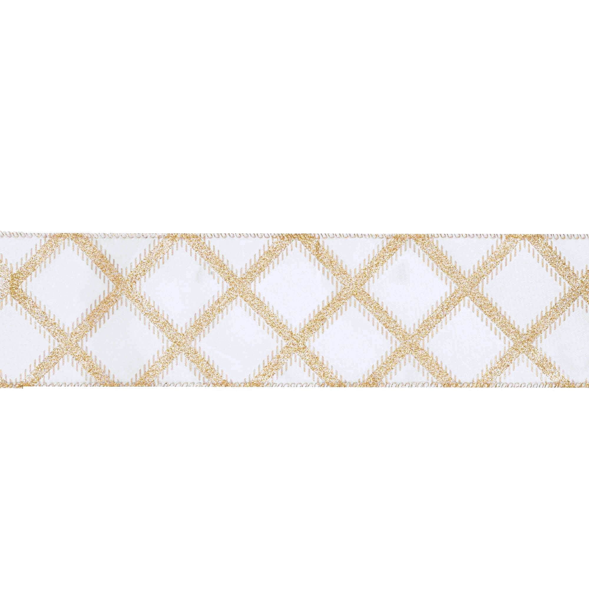 2 1/2" Wired Ribbon | Gold Glitter Diamonds on Ivory | 10 Yard Roll