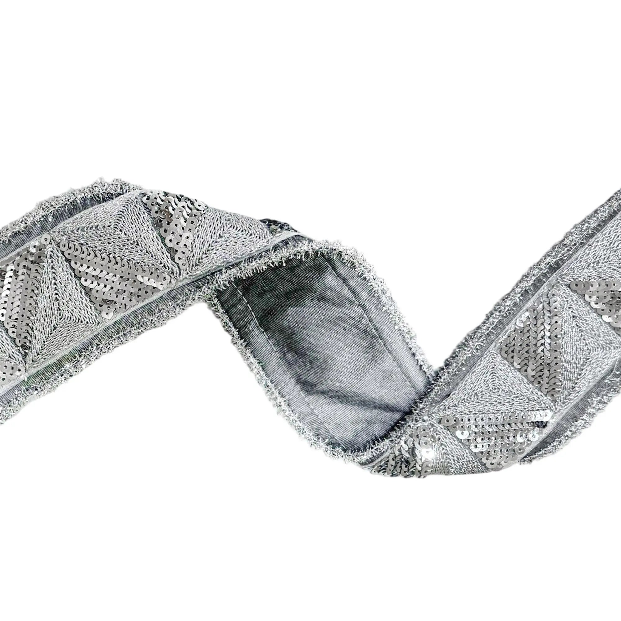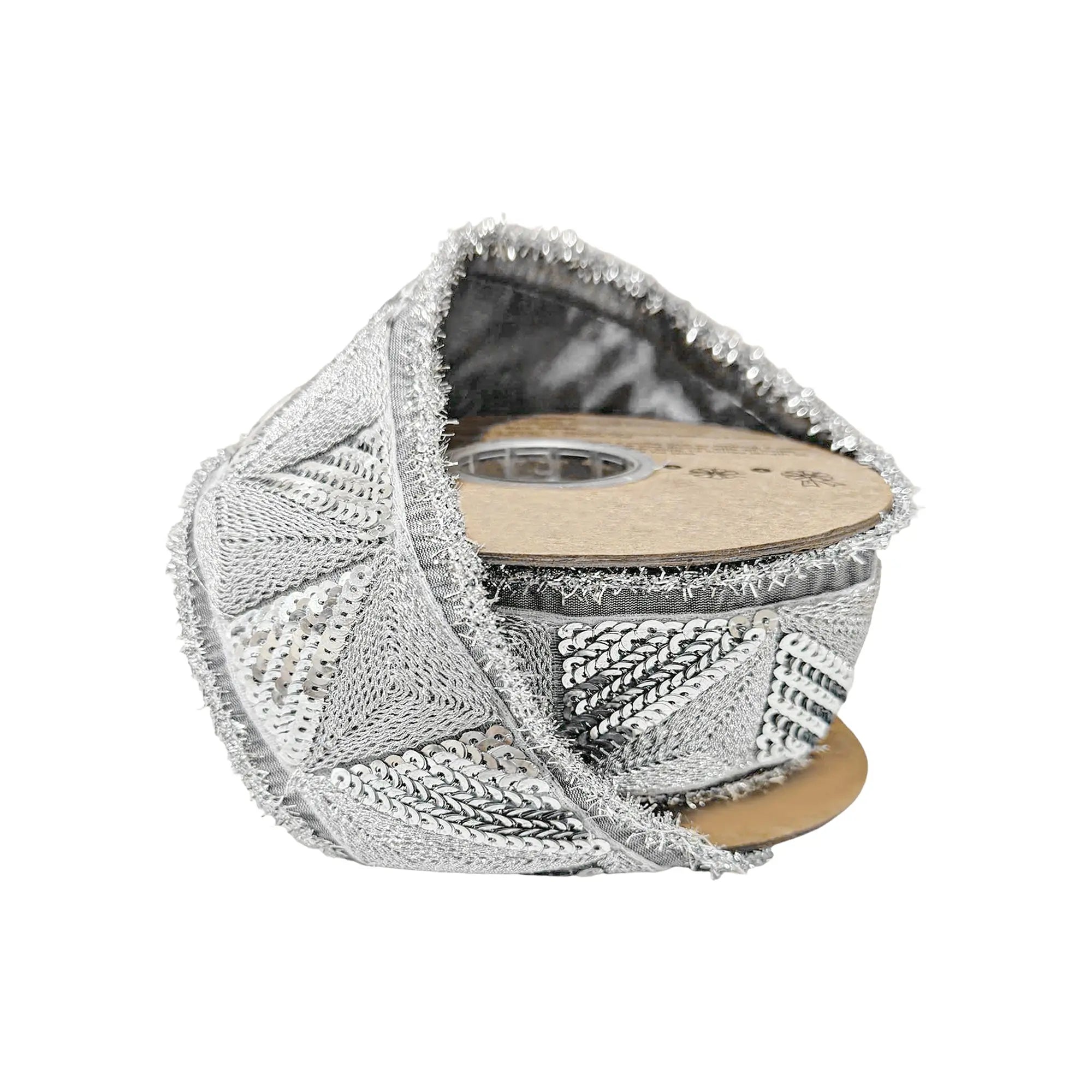 2 1/2" Wired Ribbon | Silver Sequin Trim w/ Dupioni Backing | 5 Yard Roll