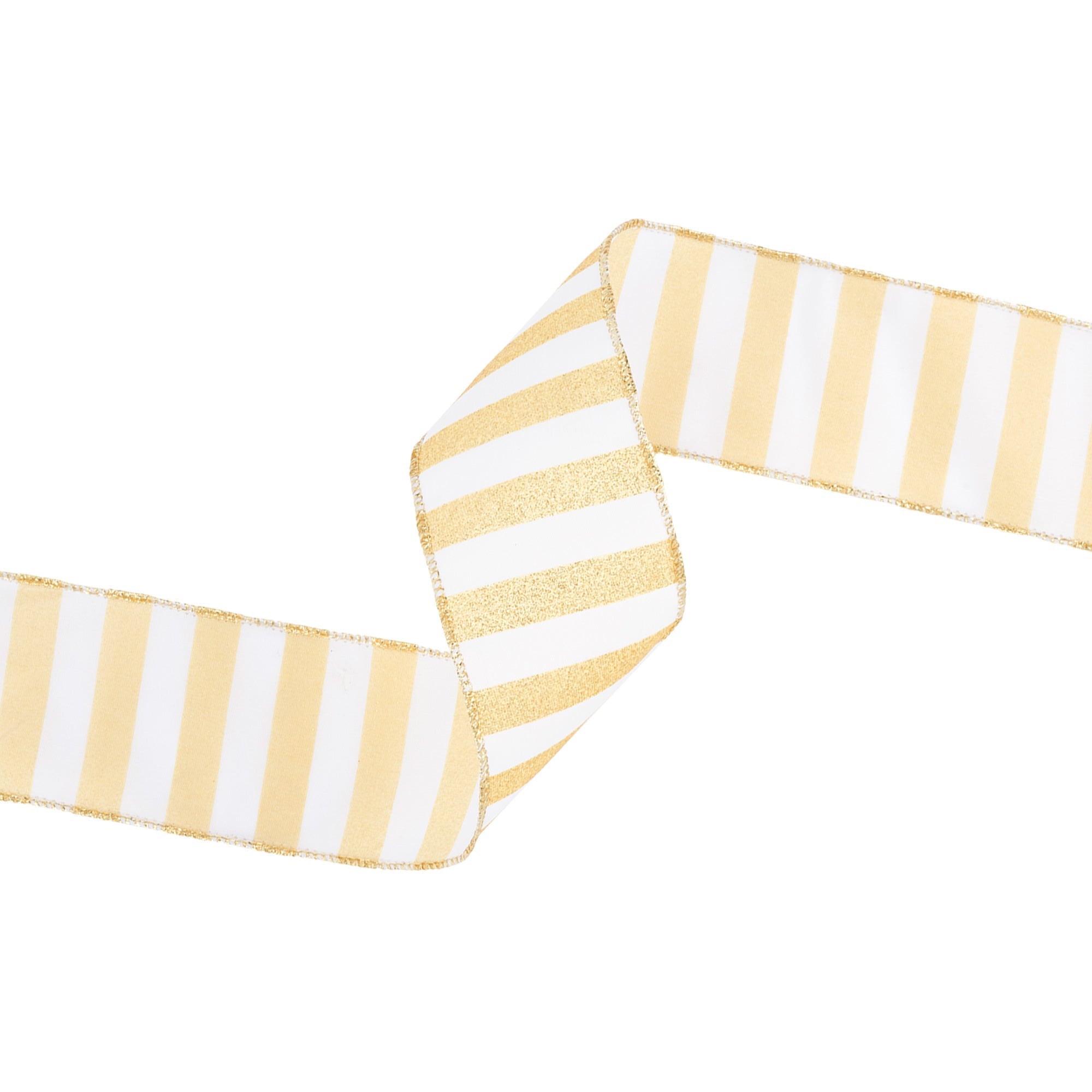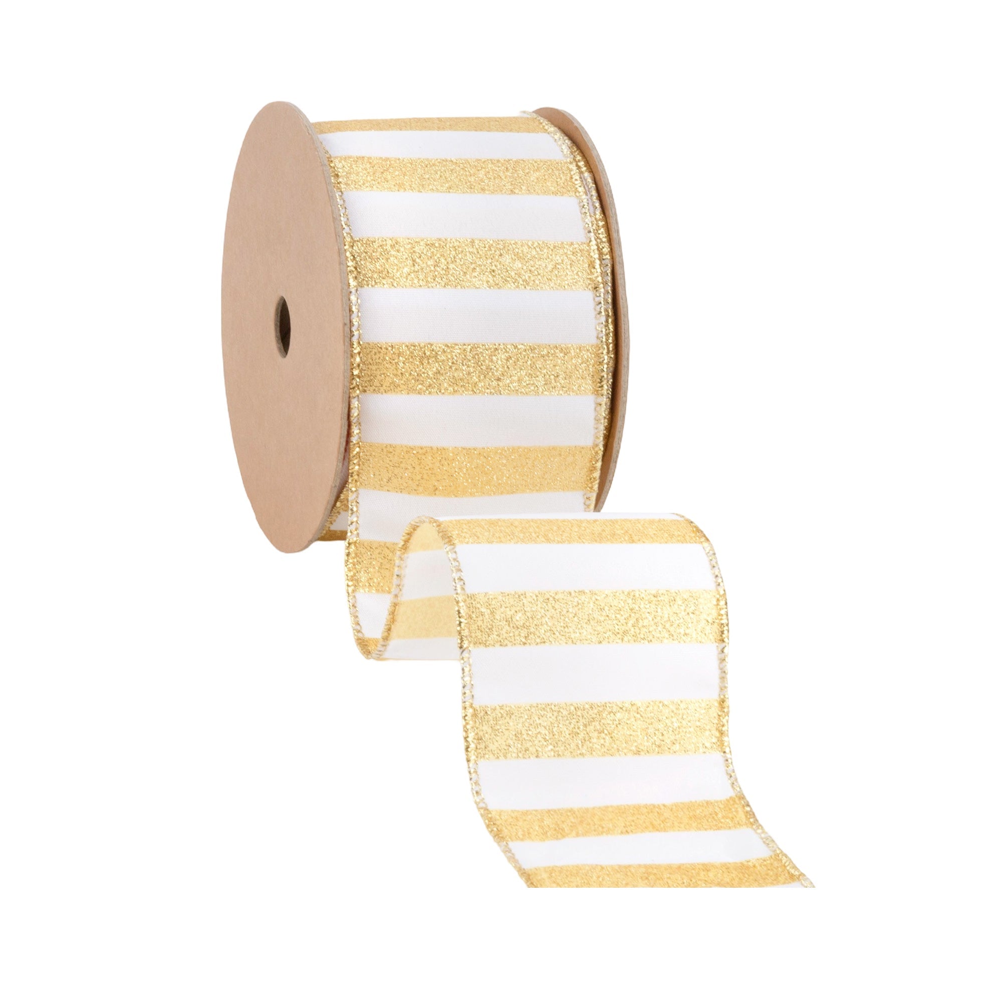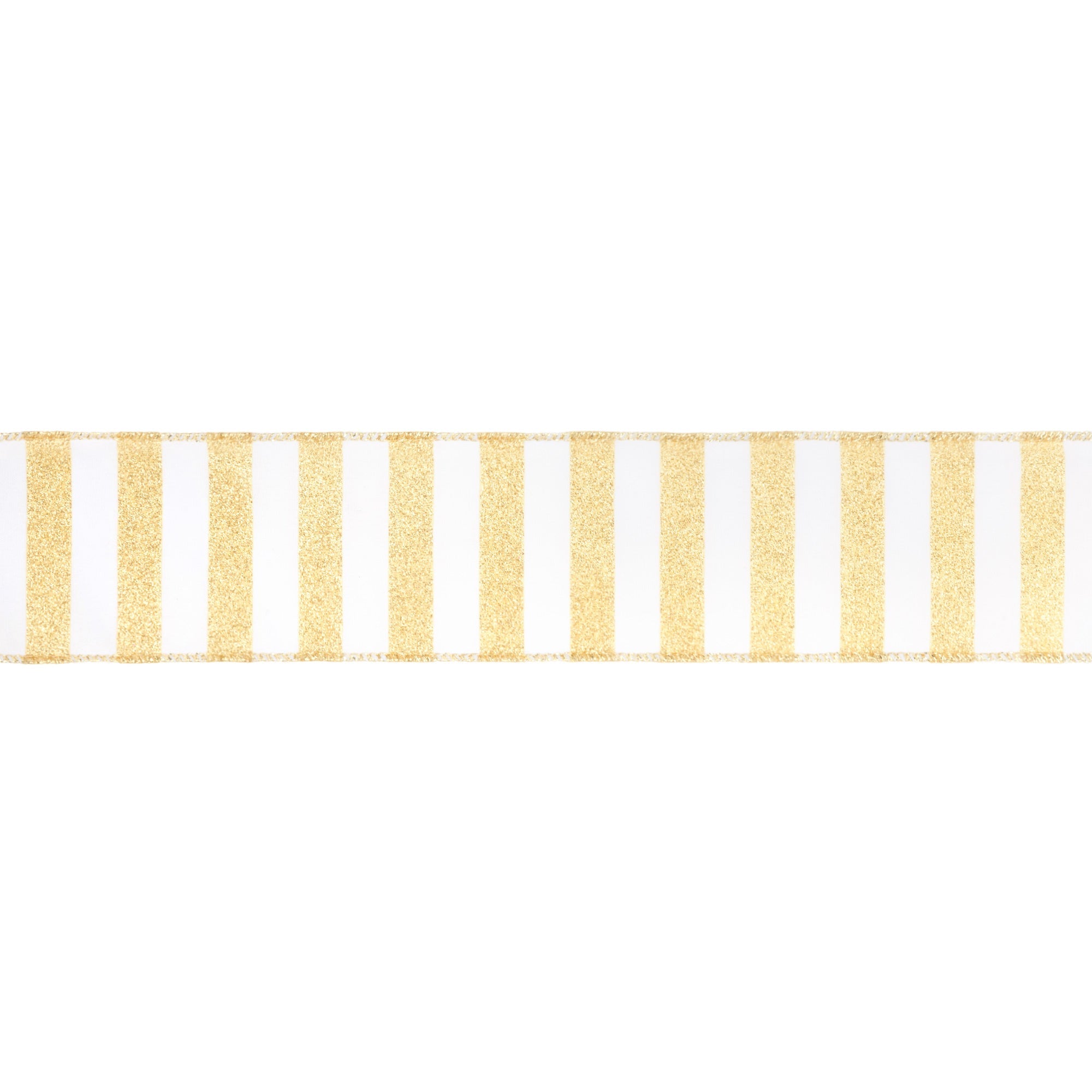 • Bold 2 1/2" white wired ribbon featuring glittered gold horizontal stripes for a sparkling, festive touch.