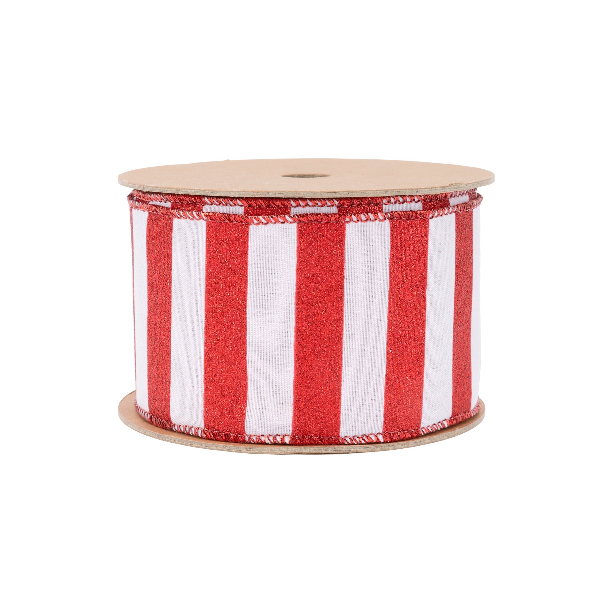 • Bold 2 1/2" white wired ribbon featuring glittered red horizontal stripes for a sparkling, festive touch.