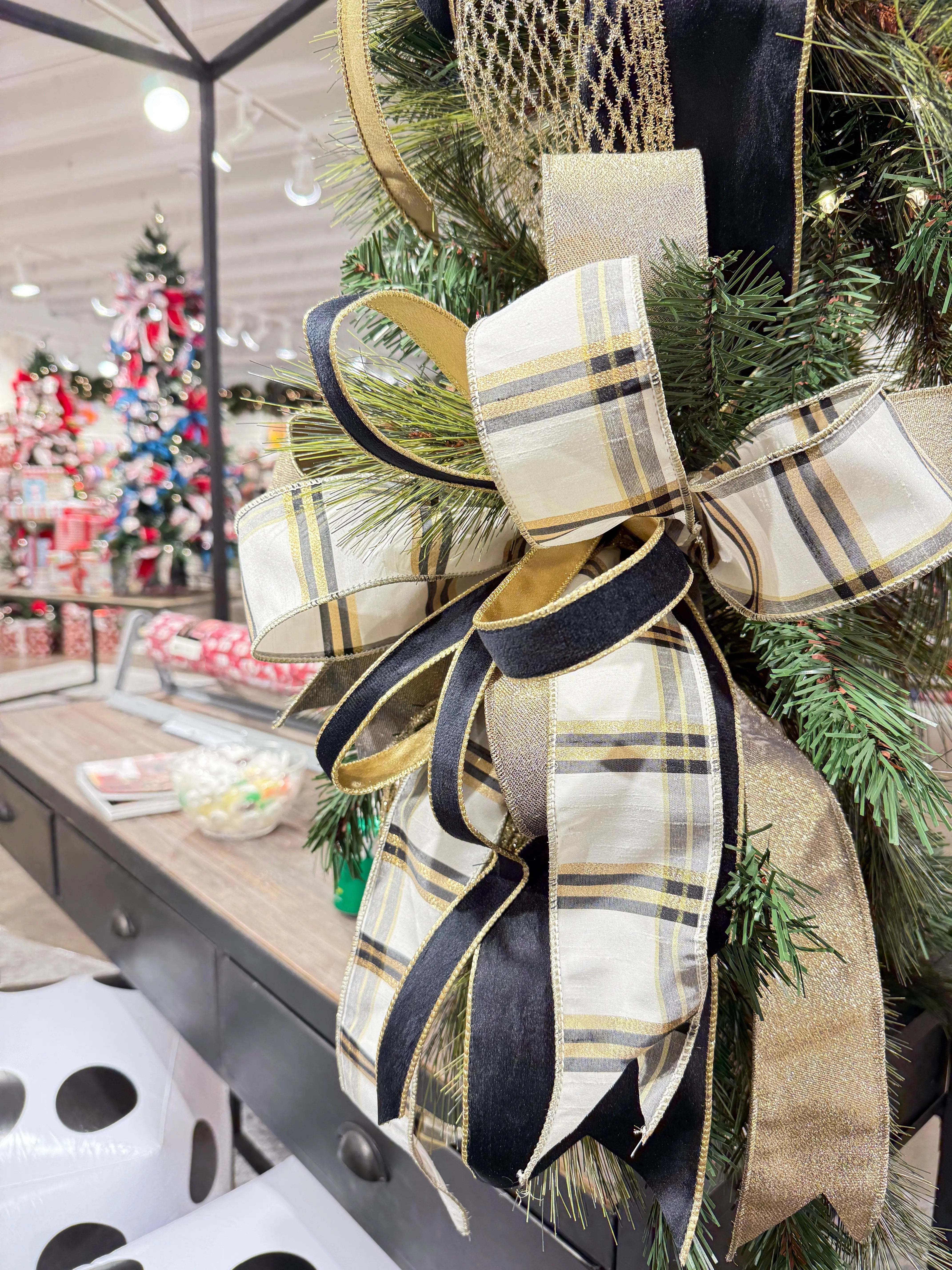 • Versatile Design: The 2 1/2" wired ribbon features a classic ivory, black, and gold plaid pattern, perfect for a variety of decor themes and projects.