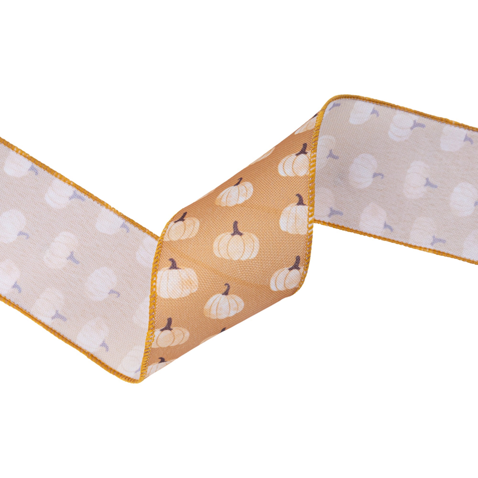 • Charming fall-inspired ribbon featuring cream-colored pumpkins on a warm natural background.