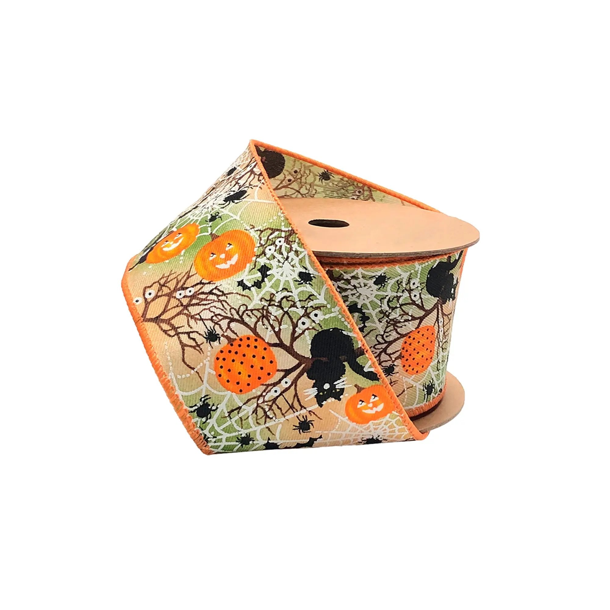The ribbon I am reviewing is for Halloween, the type crafters would use to wrap around a wreath.  A quick glance, first thing I notice are the jack o'lanterns.  These are in the classic style of a jack o'lanterns; they do not have what I think is a clownish look to them, which seems to be the trend last few years.  I appreciate these.  Also on the ribbon are spider webs (with spiders), black cats and bats.  All very much traditional Halloween.  The only graphic I personally do not care for is the pumpkin with the black dots, just not my thing.  The ribbon is 2 1/2 inches wide, perfect for wreath decorating, or wrapping around a pole of sorts (or a Halloween tree, as we do).  The wire is stiff enough to hold to the shape you want, but easily bendable.  Overall, a very nice, quality ribbon.
