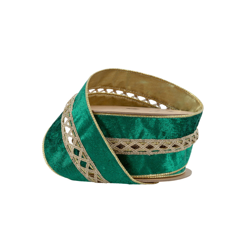2 1/2" Wired Velvet | Criss-Cross Jeweled with Green Velvet Backing | 10 Yard Roll