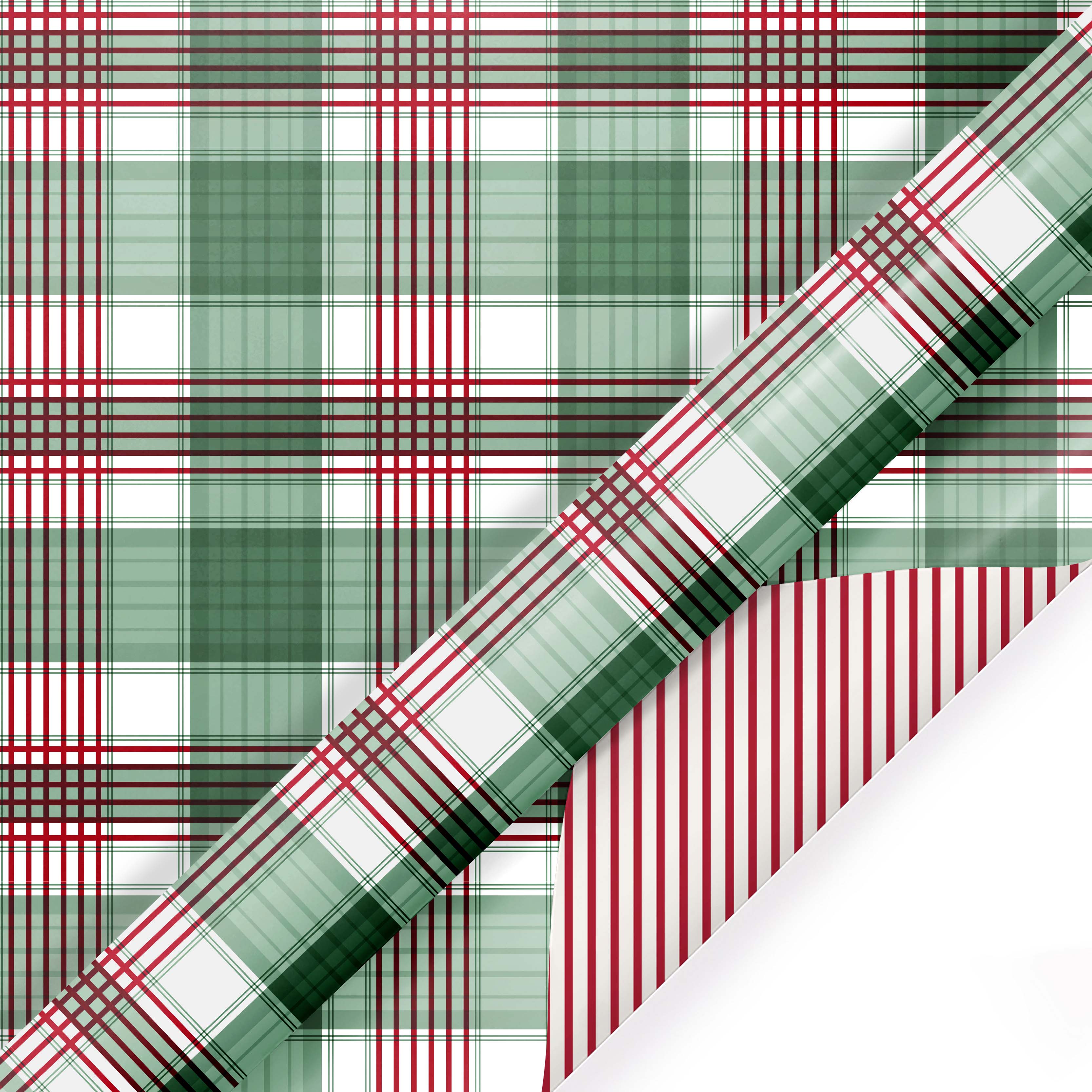 24" x 417' Reversible Holiday Wrapping Paper Half Ream | Large Red and Green Plaid/Red and White Stripe