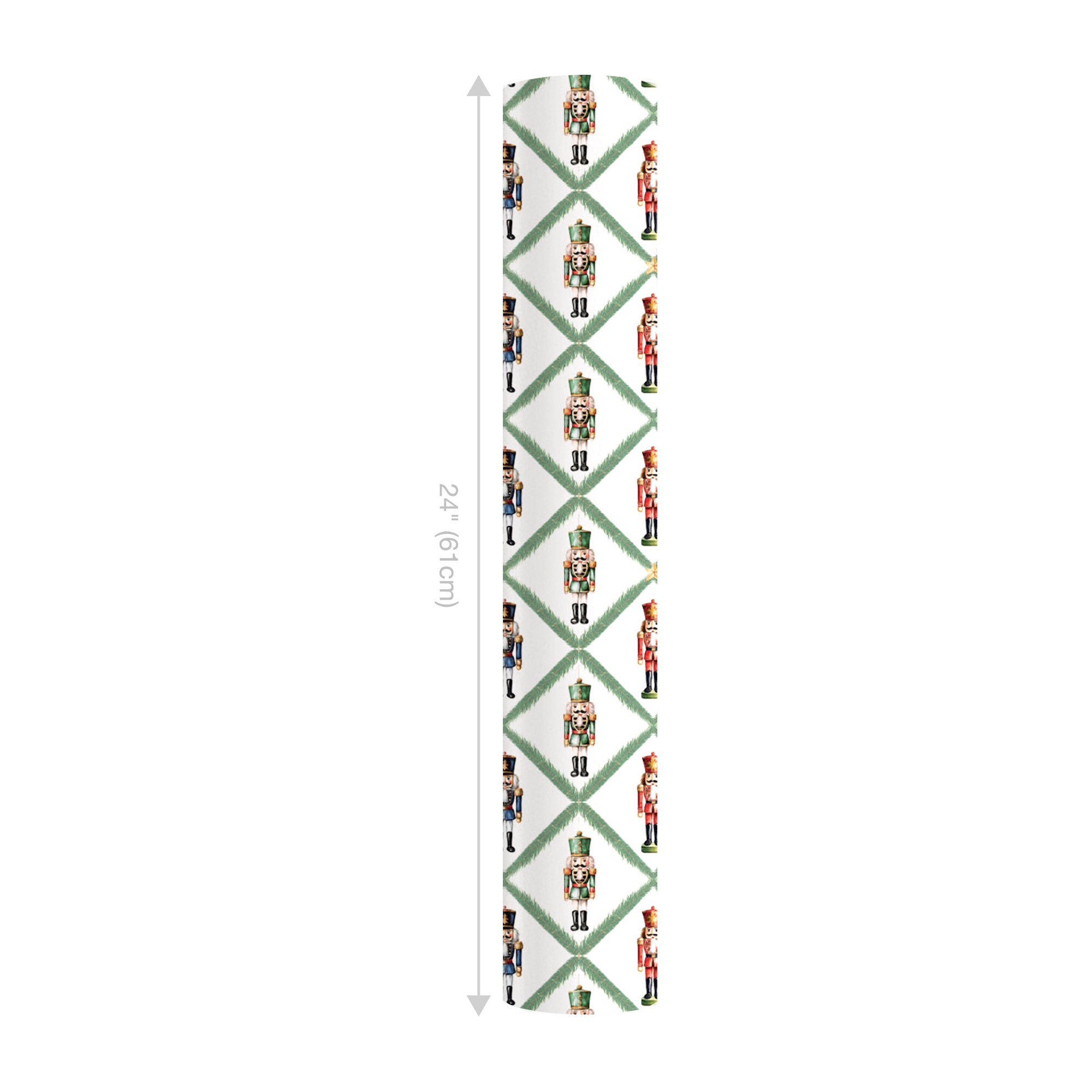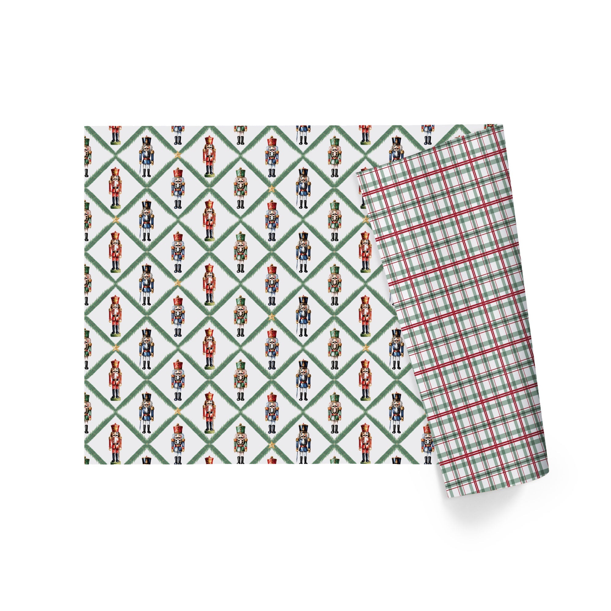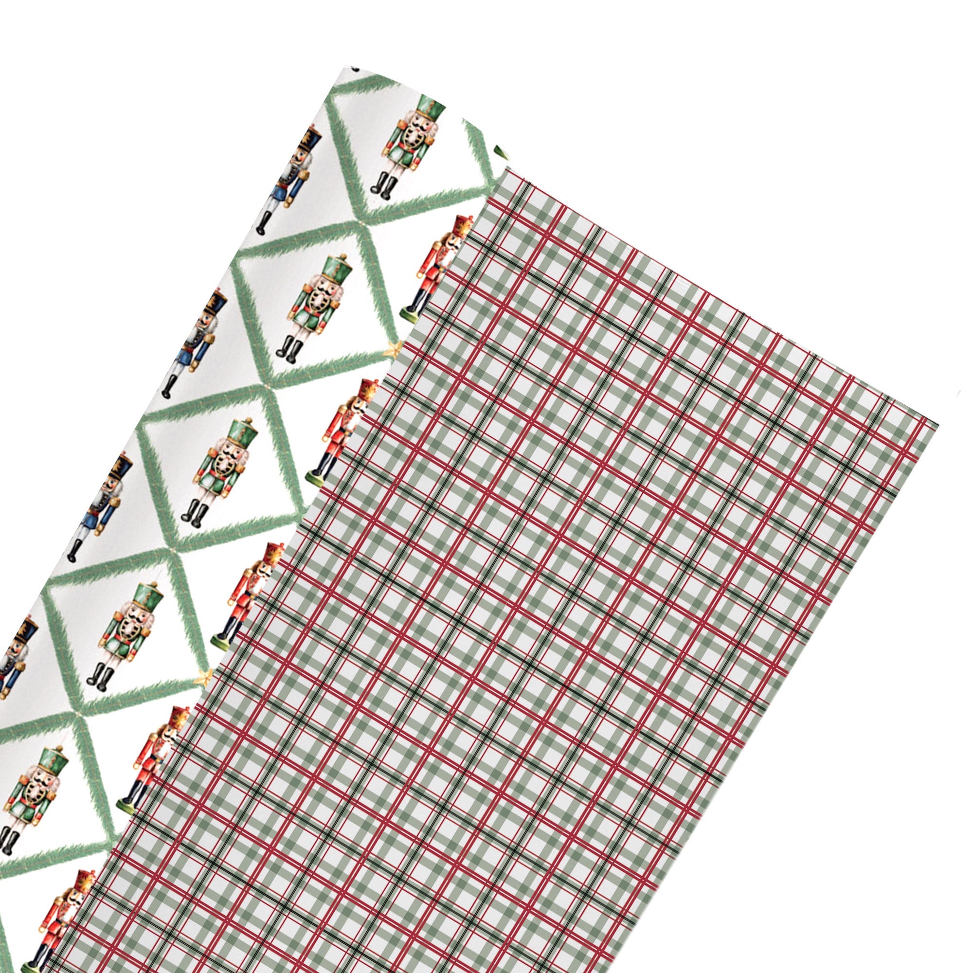 • 24" x 417' reversible holiday wrapping paper featuring two festive designs: Side 1: Classic nutcracker soldiers in red, green, and blue, framed by Norfolk pine garland for a traditional holiday feel. Side 2: Timeless red, green, and white plaid pattern for a cozy and versatile wrapping option.