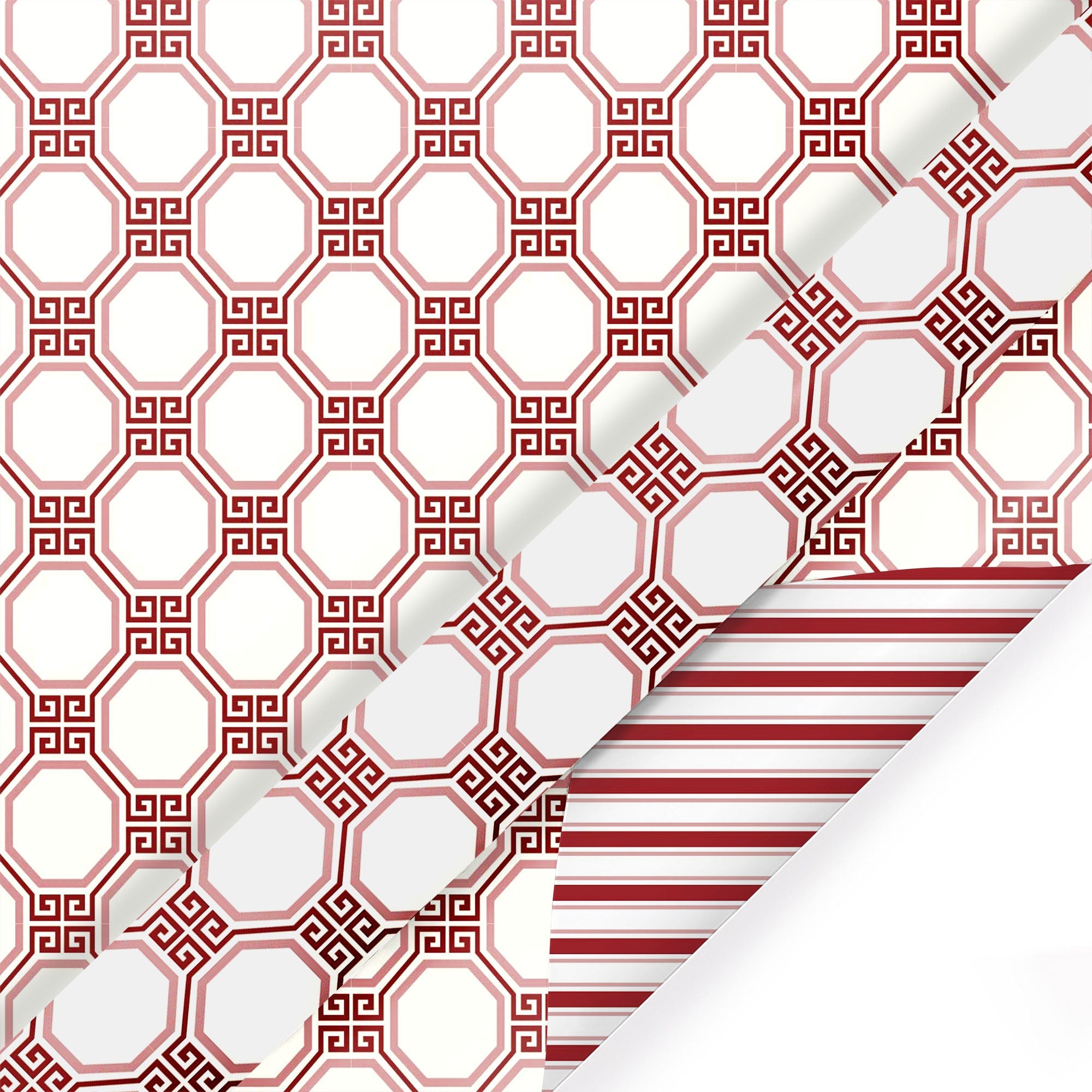 24" x 417' Reversible Holiday Wrapping Paper Half Ream | Red and White Harlequin Greek Key/Red White Stripe
