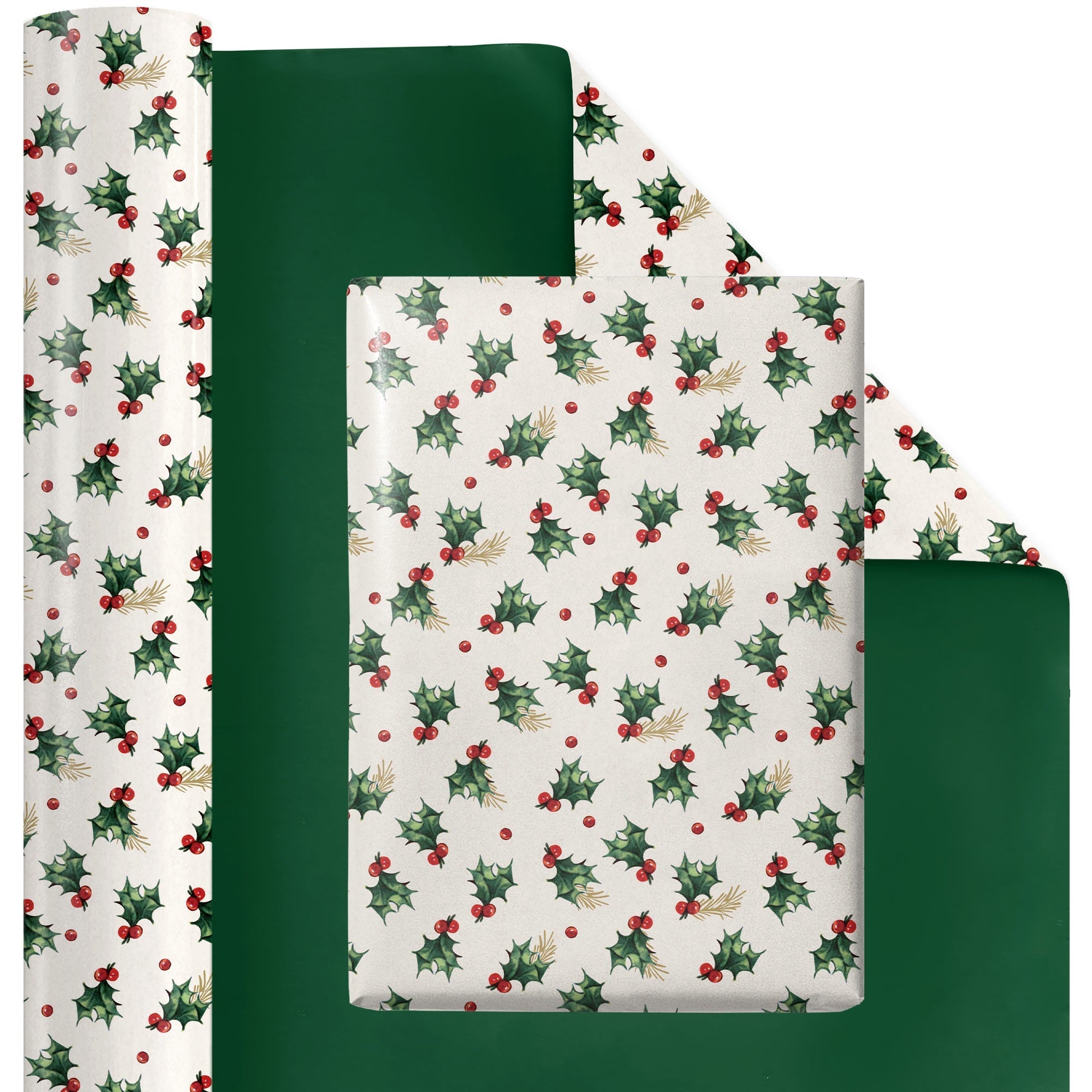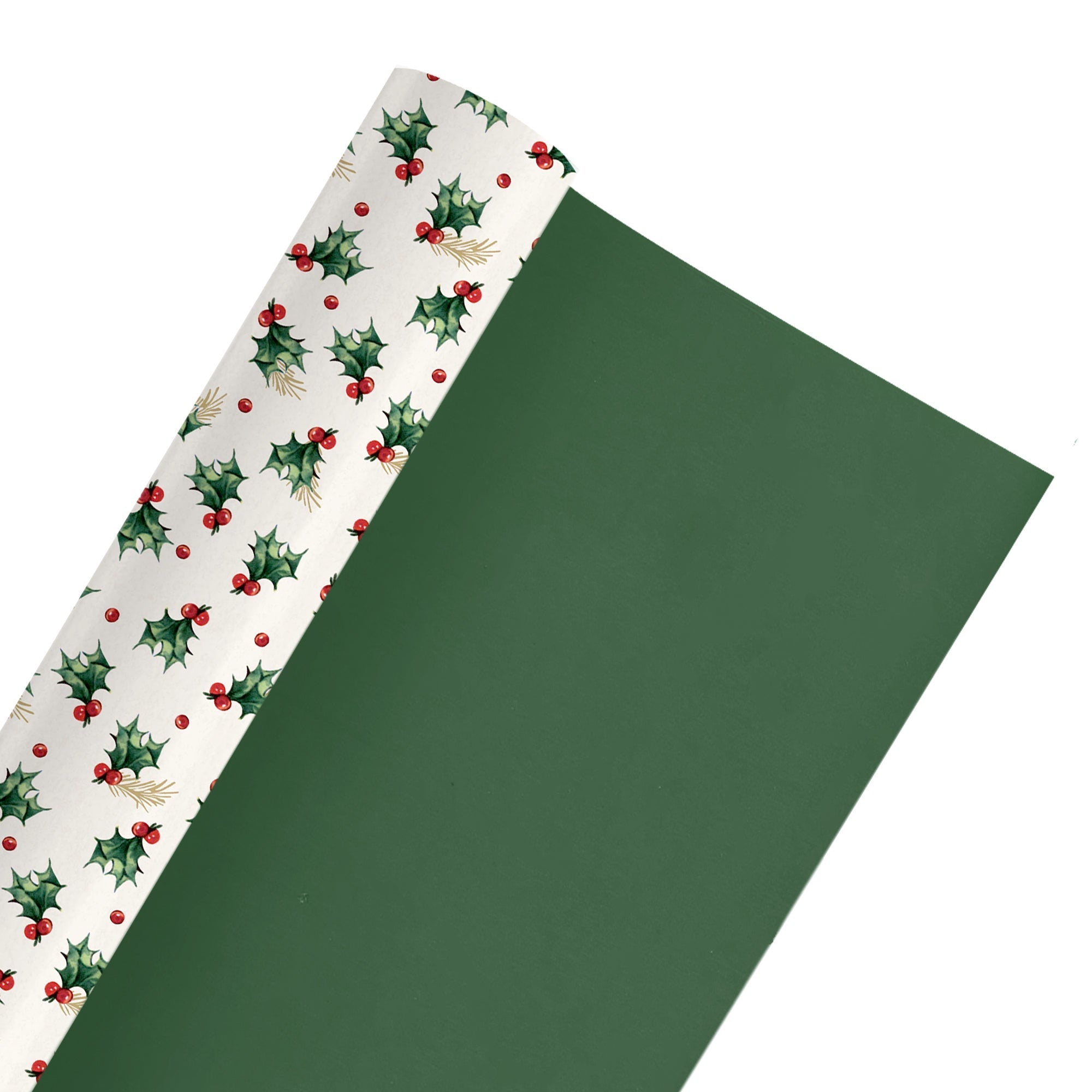 24" x 417' Reversible Holiday Wrapping Paper Half Ream | Vintage Holly/Green Metallic Solids