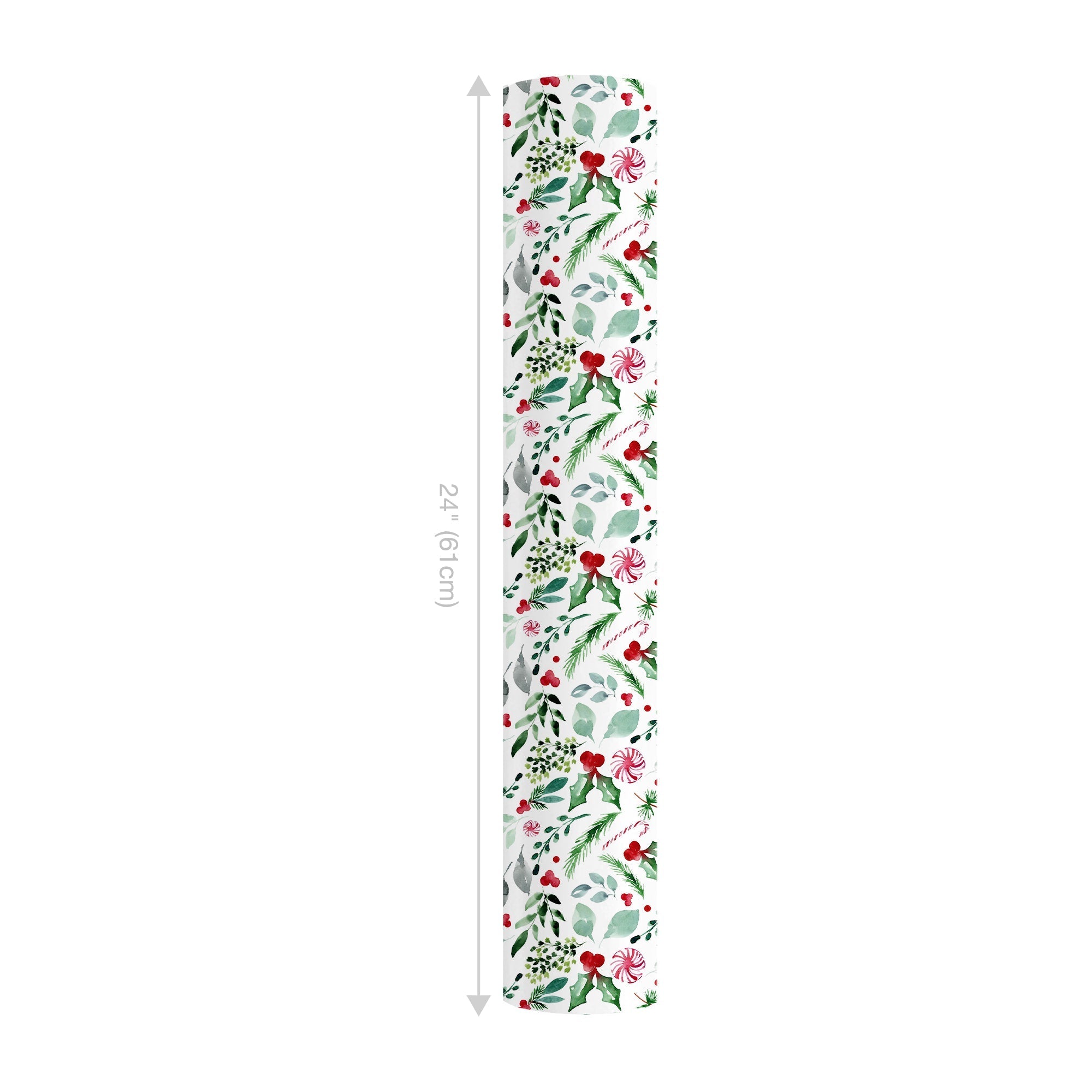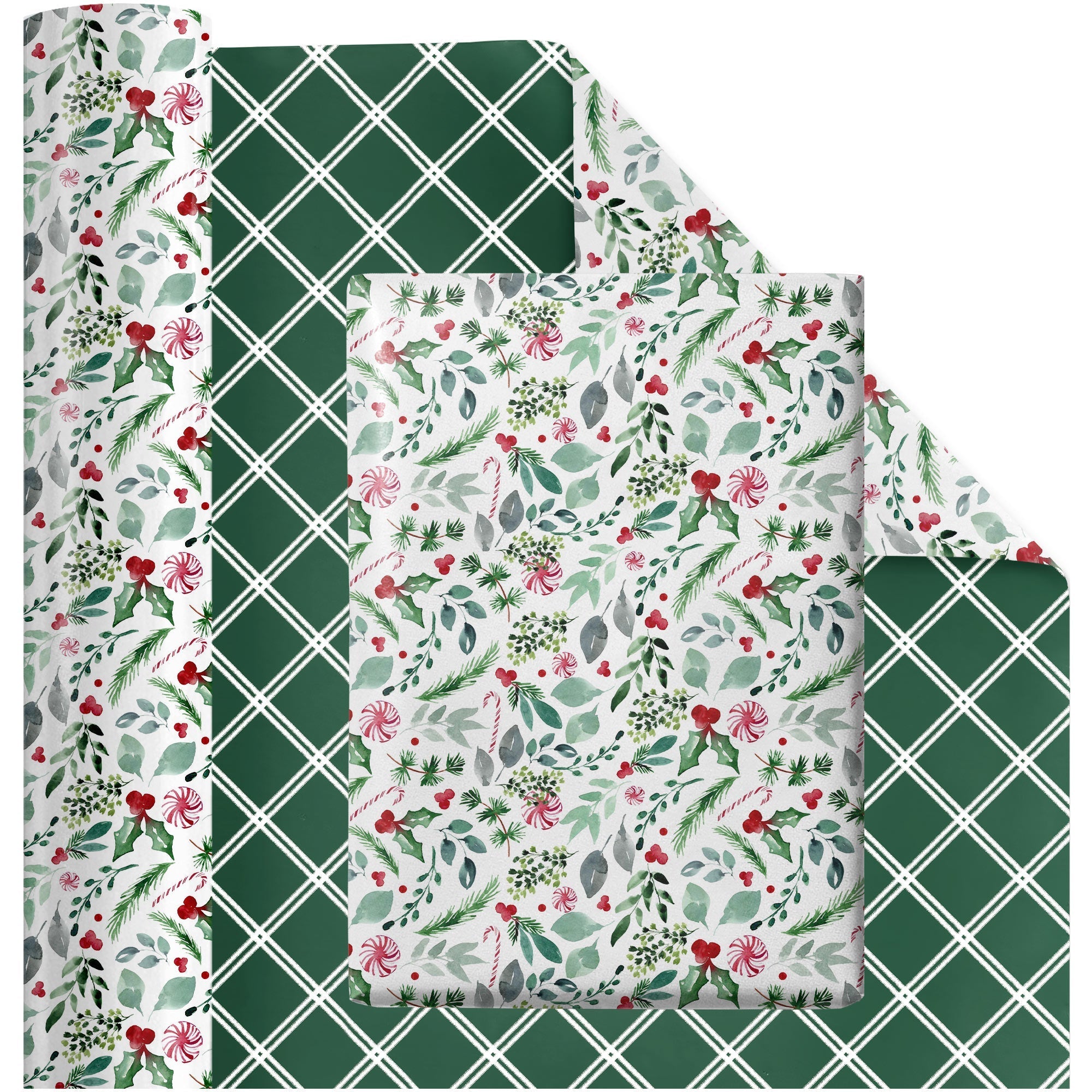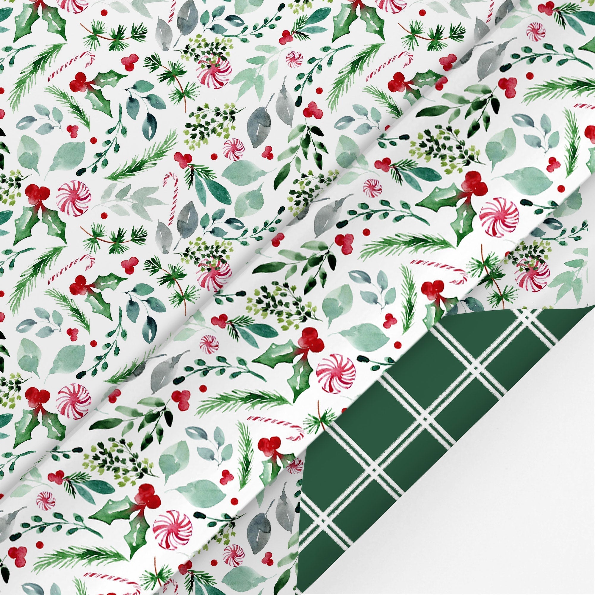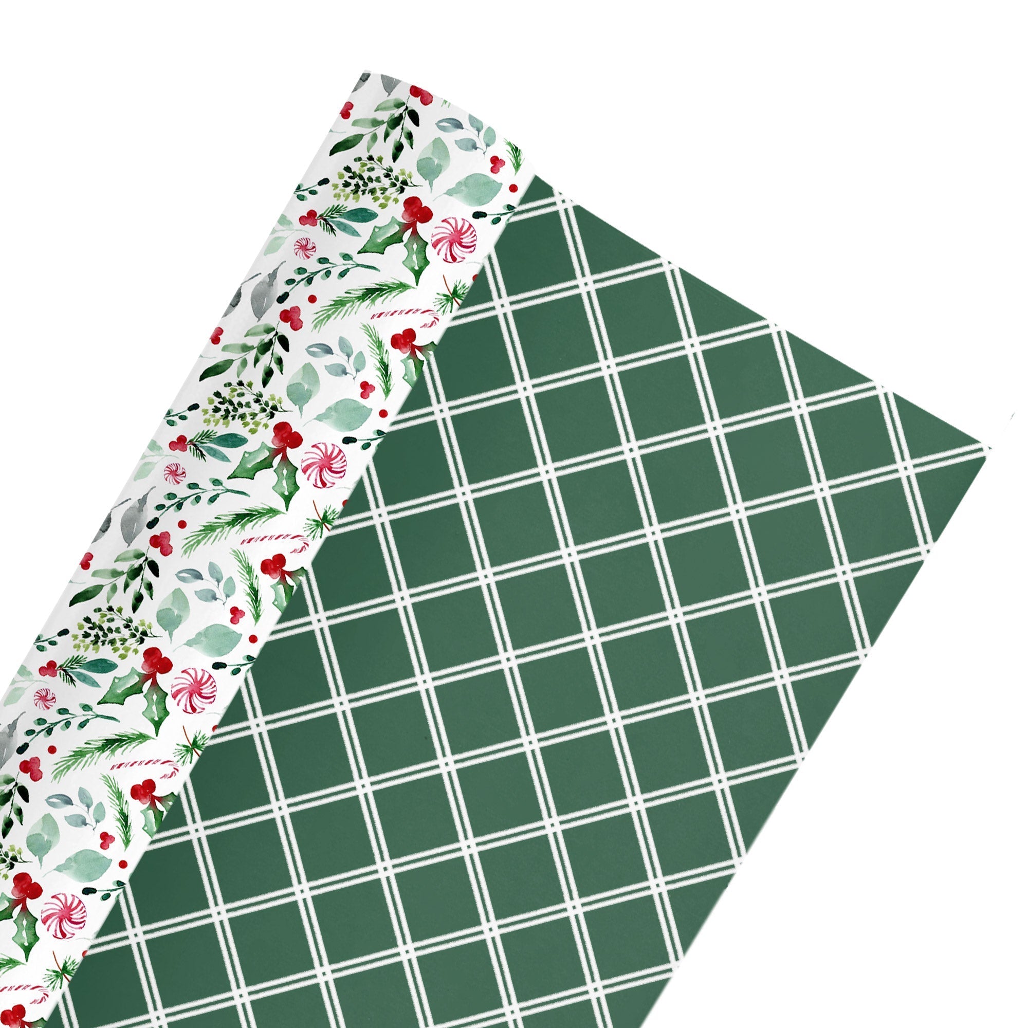 24" x 417' Reversible Holiday Wrapping Paper Half Ream | Watercolor Holly/Green and White Lattice