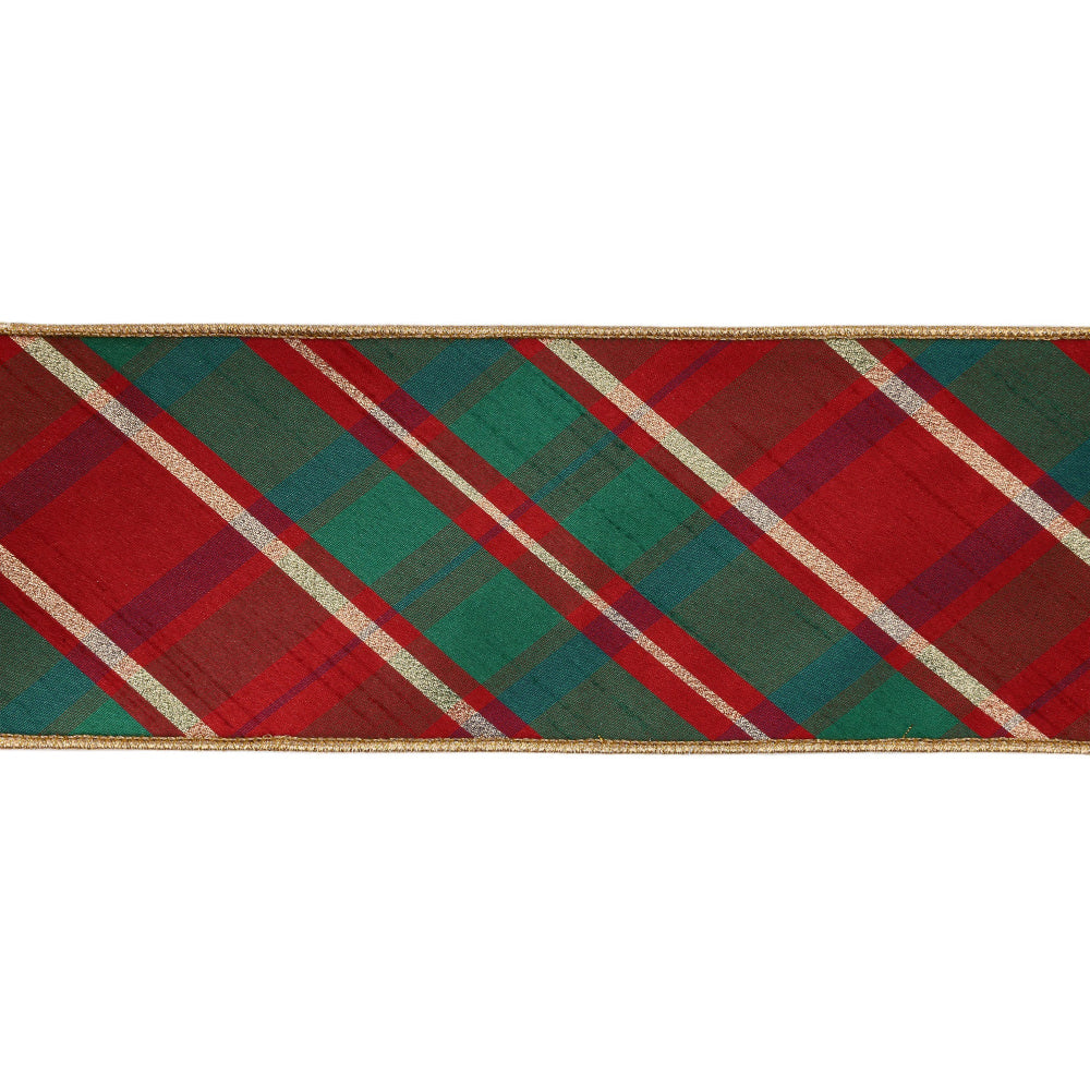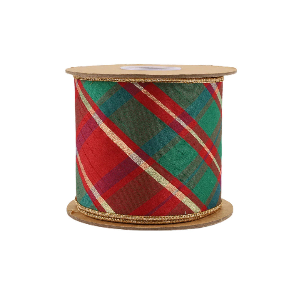 • Luxurious 4" Wired Dupioni ribbon: Crafted in a classic red/green/gold plaid pattern with a double-fused gold backing, exuding opulence and style.
