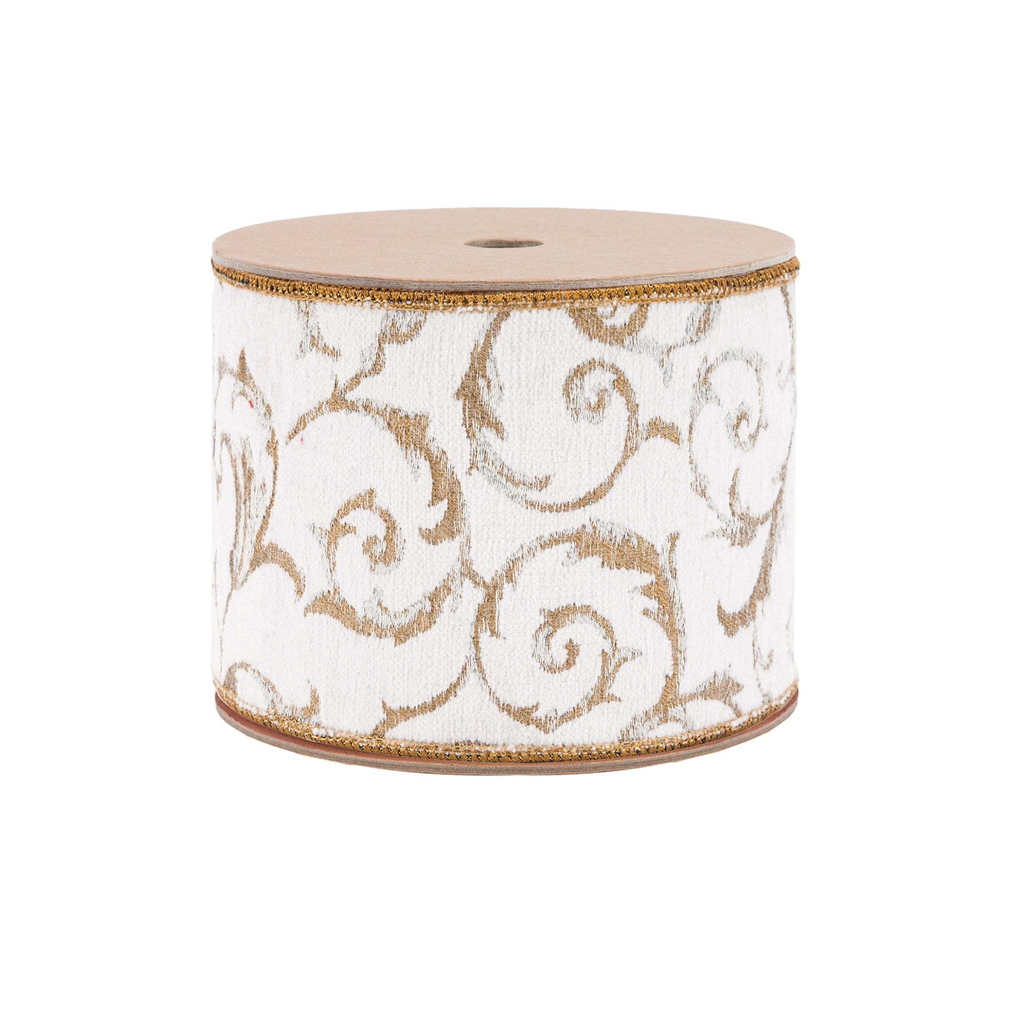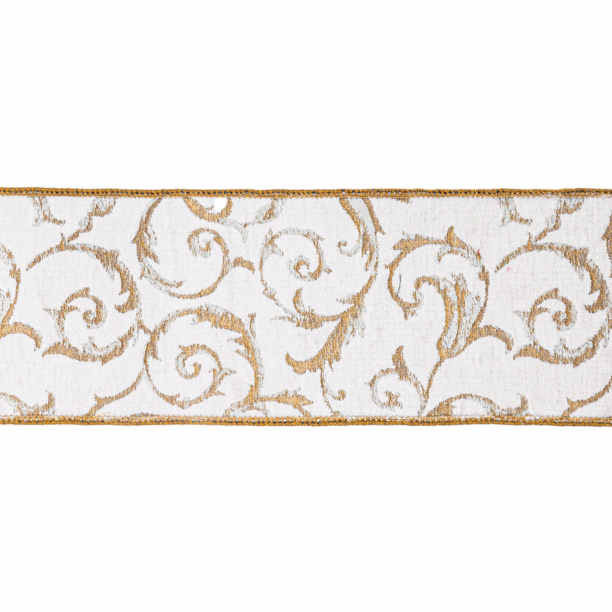 4" Wired Jacquard Ribbon | Metallic Scroll on Ivory w/ Gold Metallic Dupioni-fused Backing | 10 Yard Roll