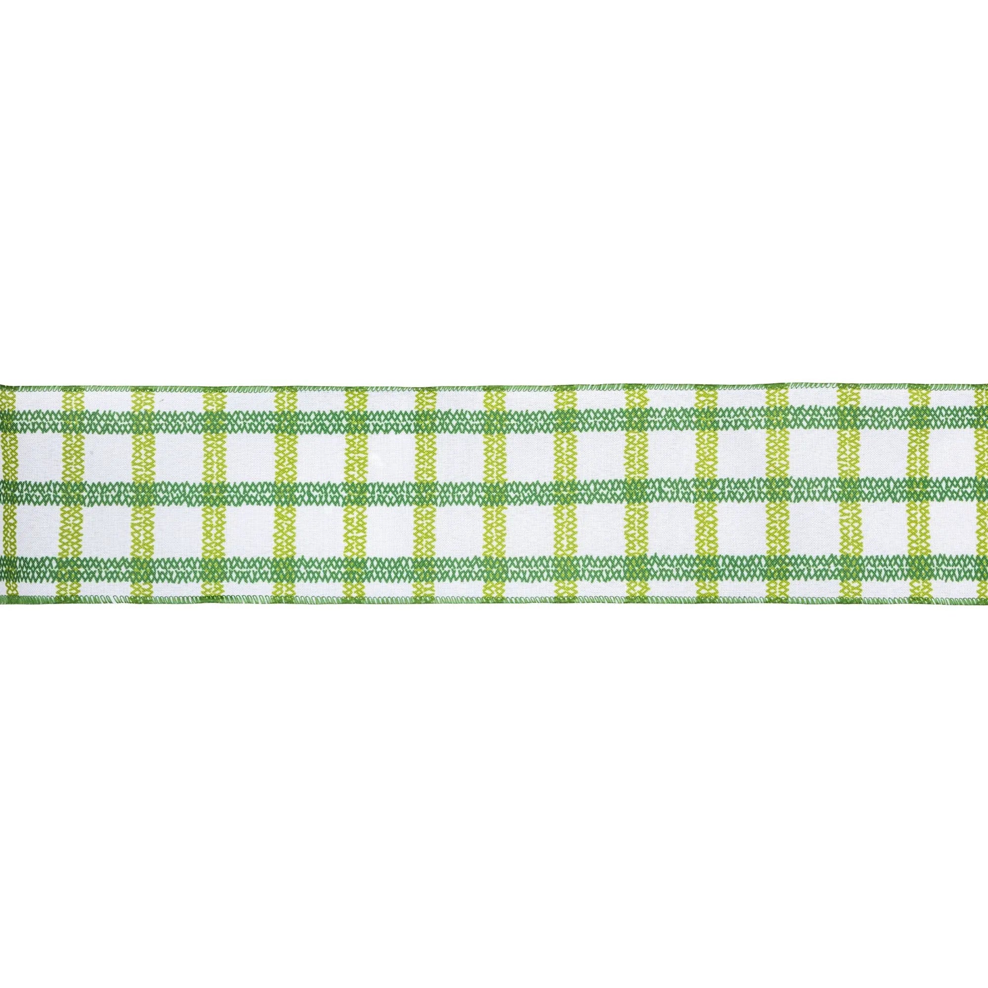 4" Wired Ribbon | Green Grid on White Linen | 10 Yard Roll