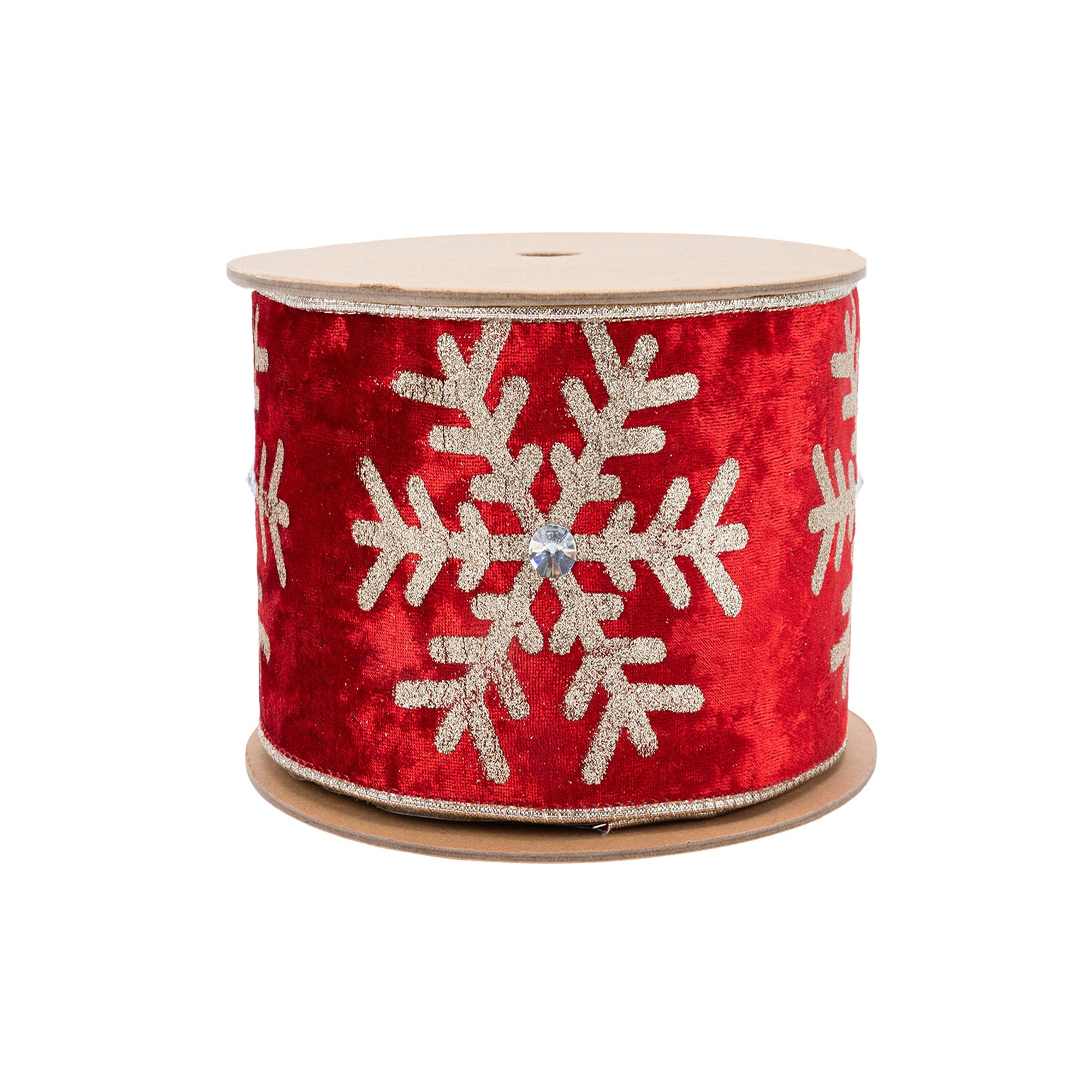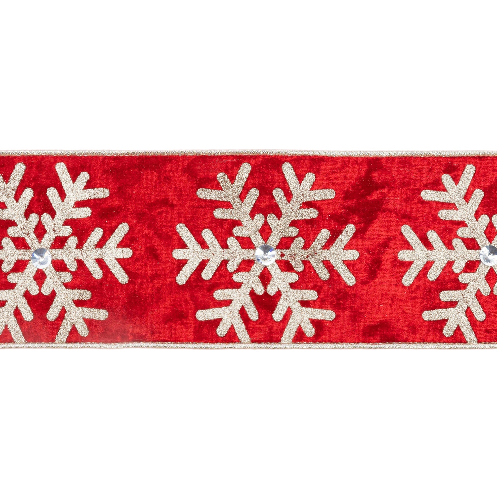 • Elegant red velvet ribbon featuring a shimmering gold snowflake with a central jewel accent.