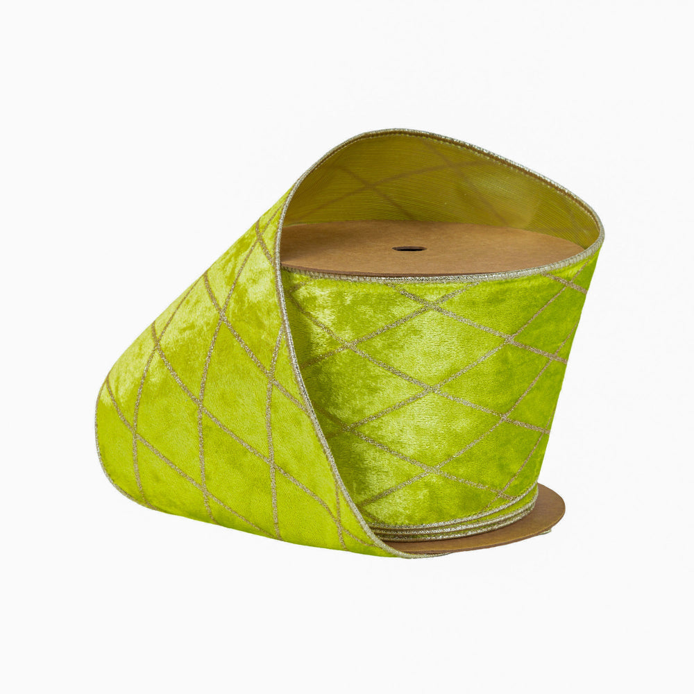 4" Wired Velvet Ribbon | Lime with Glittered Diamond | 10 Yard Roll