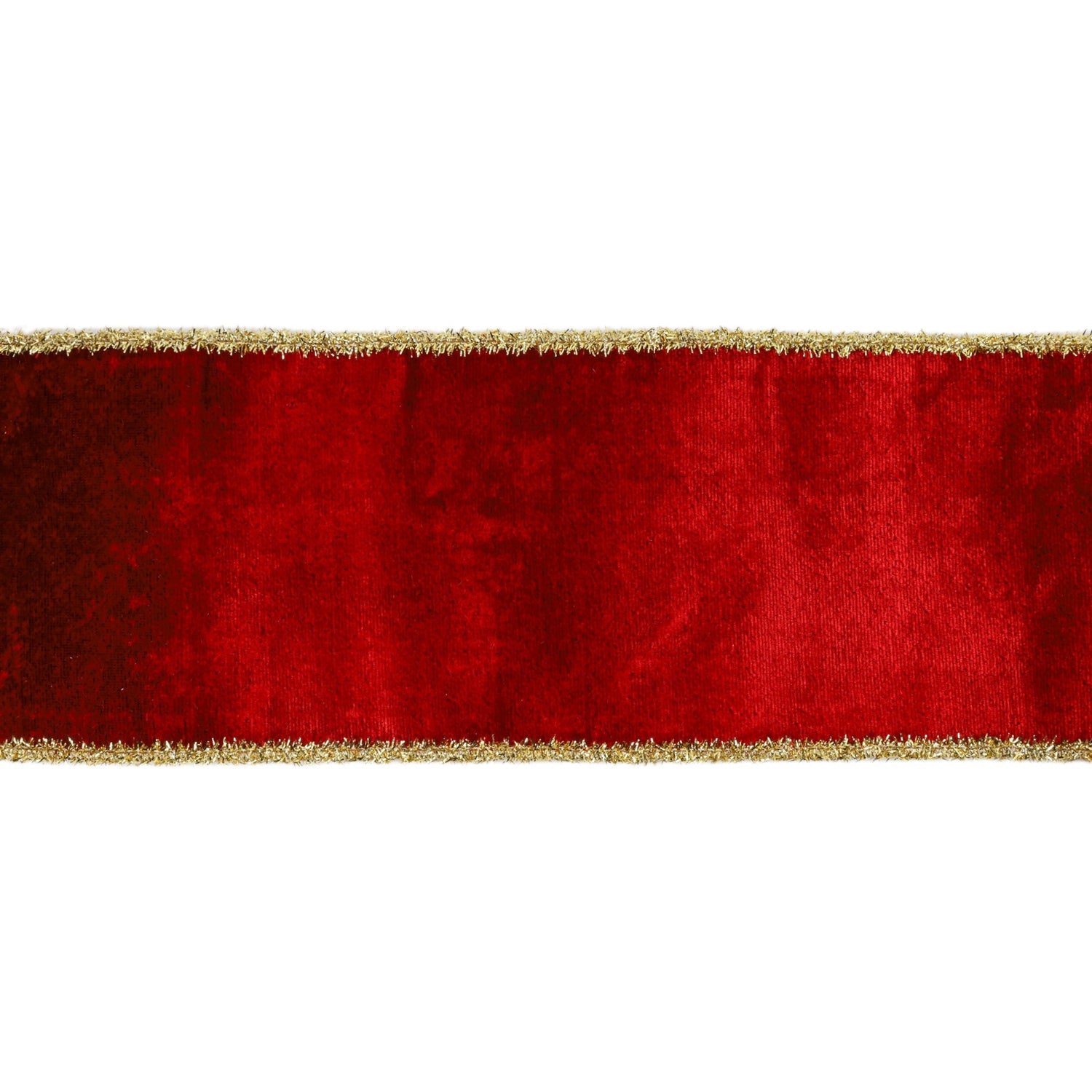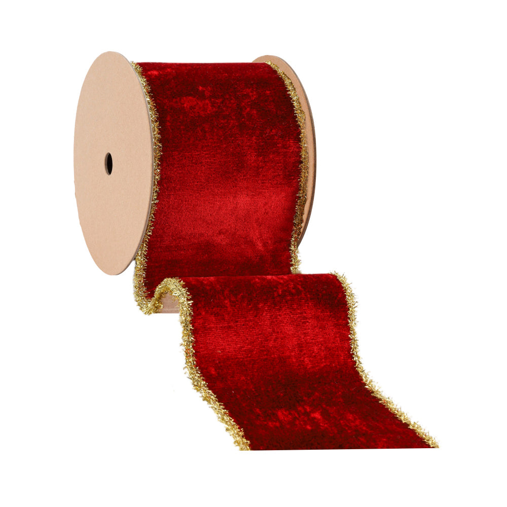 4" Wired Velvet Ribbon | Red w/ Gold Tinsel Edge & Metallic Gold Backing | 5 Yard Roll