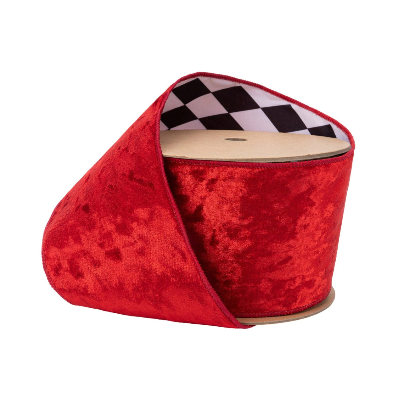 • Elegant 4" red crushed velvet wired ribbon with a bold black and white diamond-patterned backing for a striking contrast.