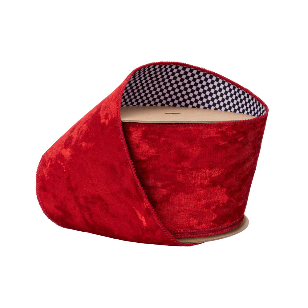 • Luxurious 4" red crushed velvet wired ribbon with a bold black and white check backing for a striking contrast.