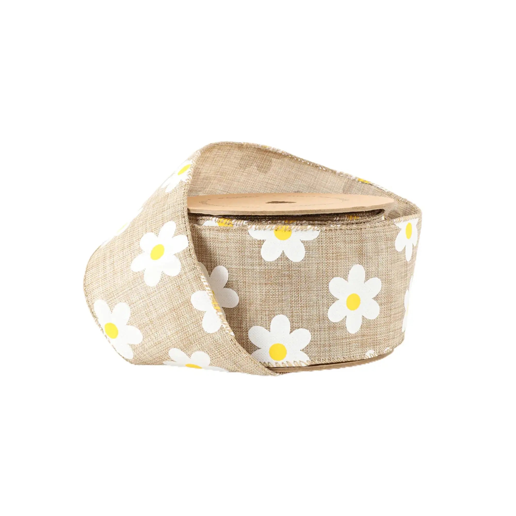 2 1/2" Wired Ribbon | Natural Linen w/ White Daisy | 10 Yard Roll
