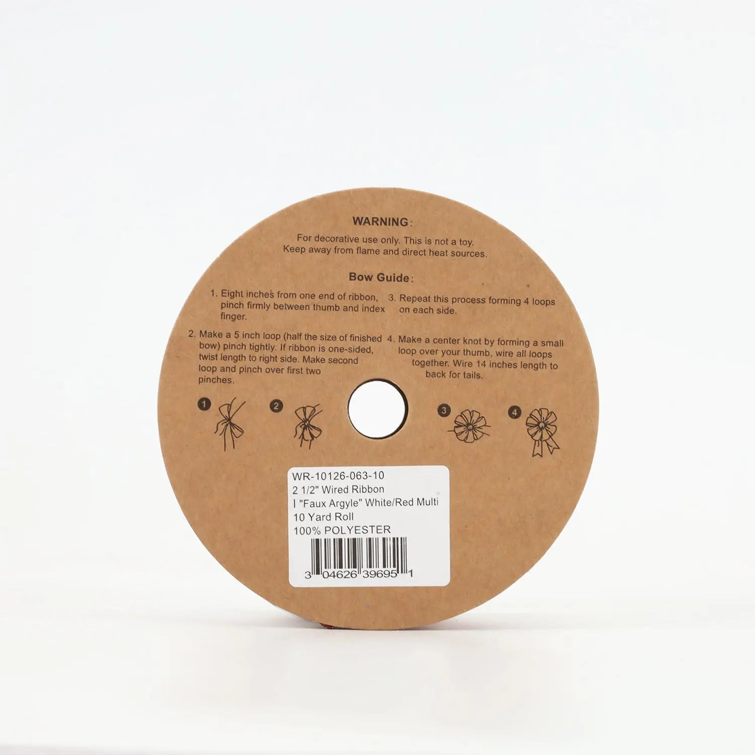 2 1/2" Wired Ribbon | "Faux Argyle" White/Red Multi | 10 Yard Roll