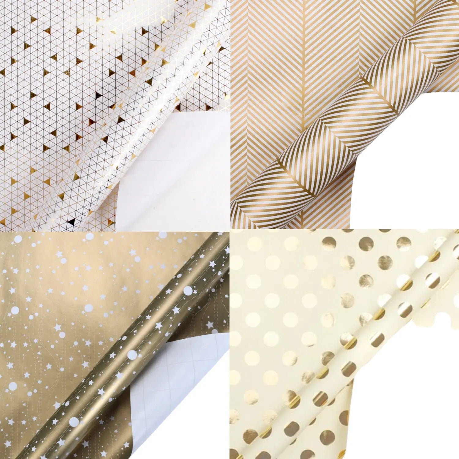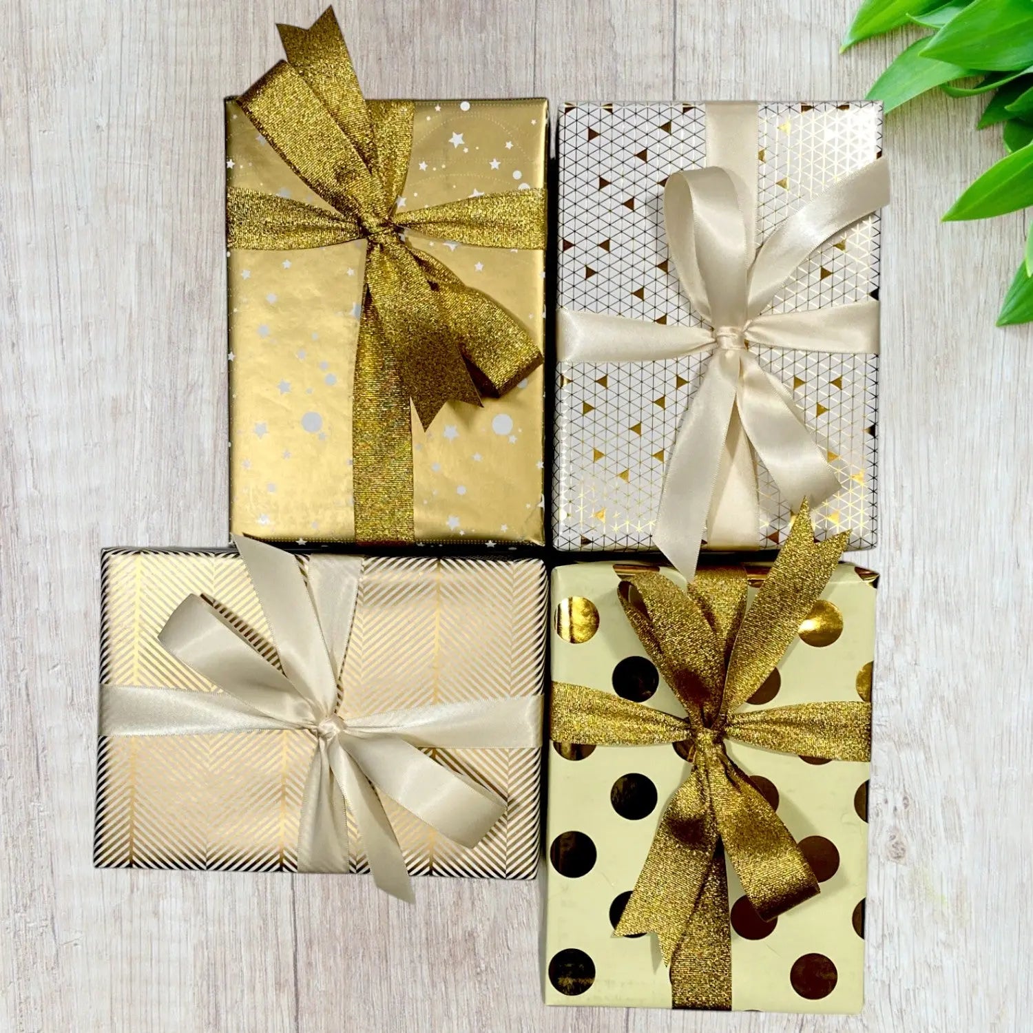 • Gold Herringbone, Ivory Gold Polka Dot, Gold Art Deco and Metallic Gold Triangles patterned wrapping paper rolls.