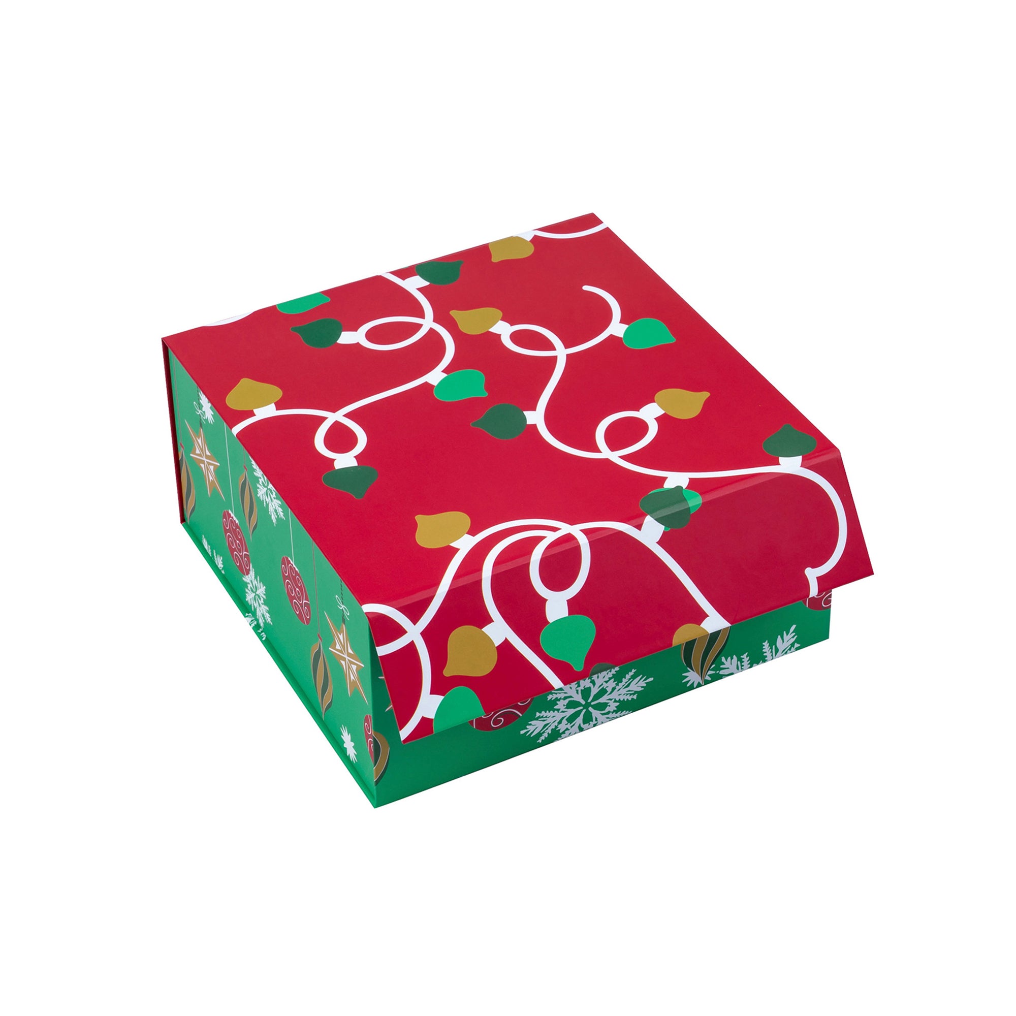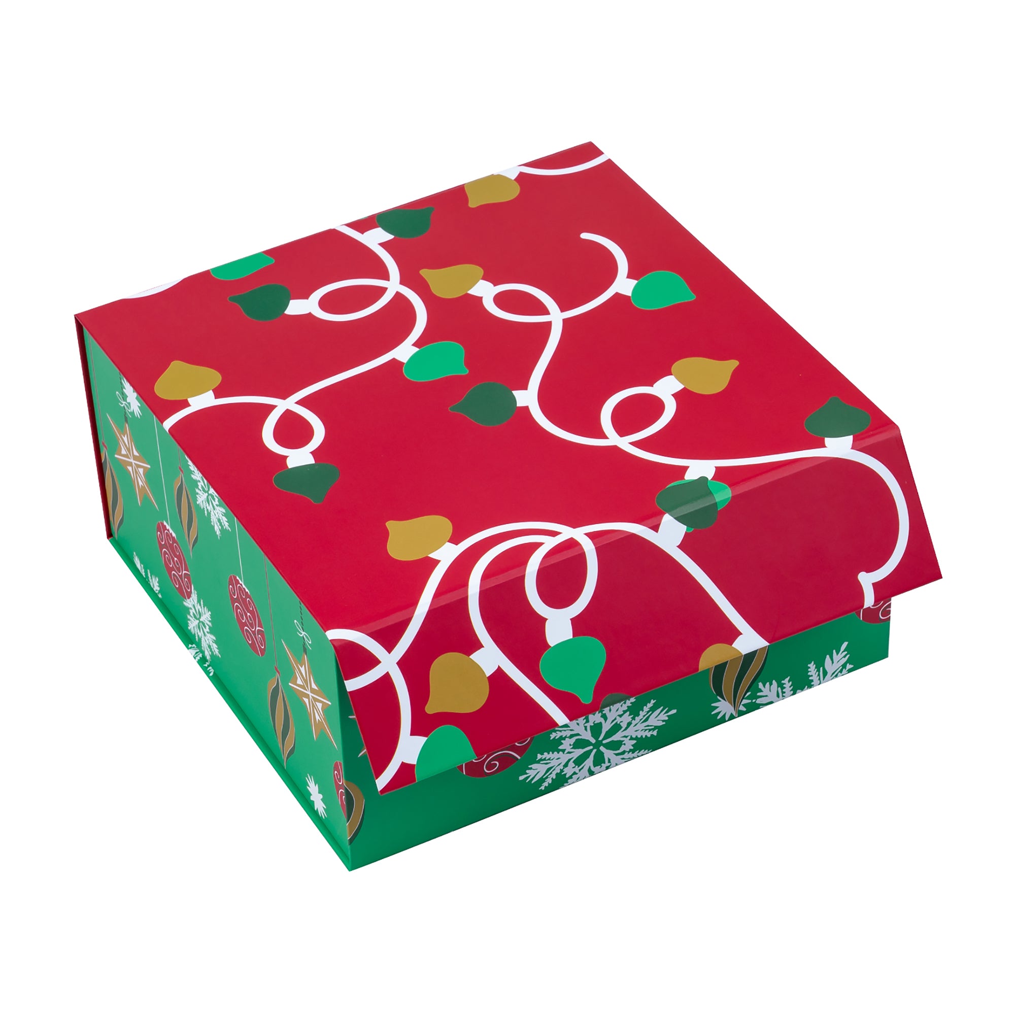 8" x 8" x 4" Collapsable Holiday Gift Box w/ 2-pcs White Tissue Paper & Magnetic Square Flap Lid | Red/Green Christmas Ornaments