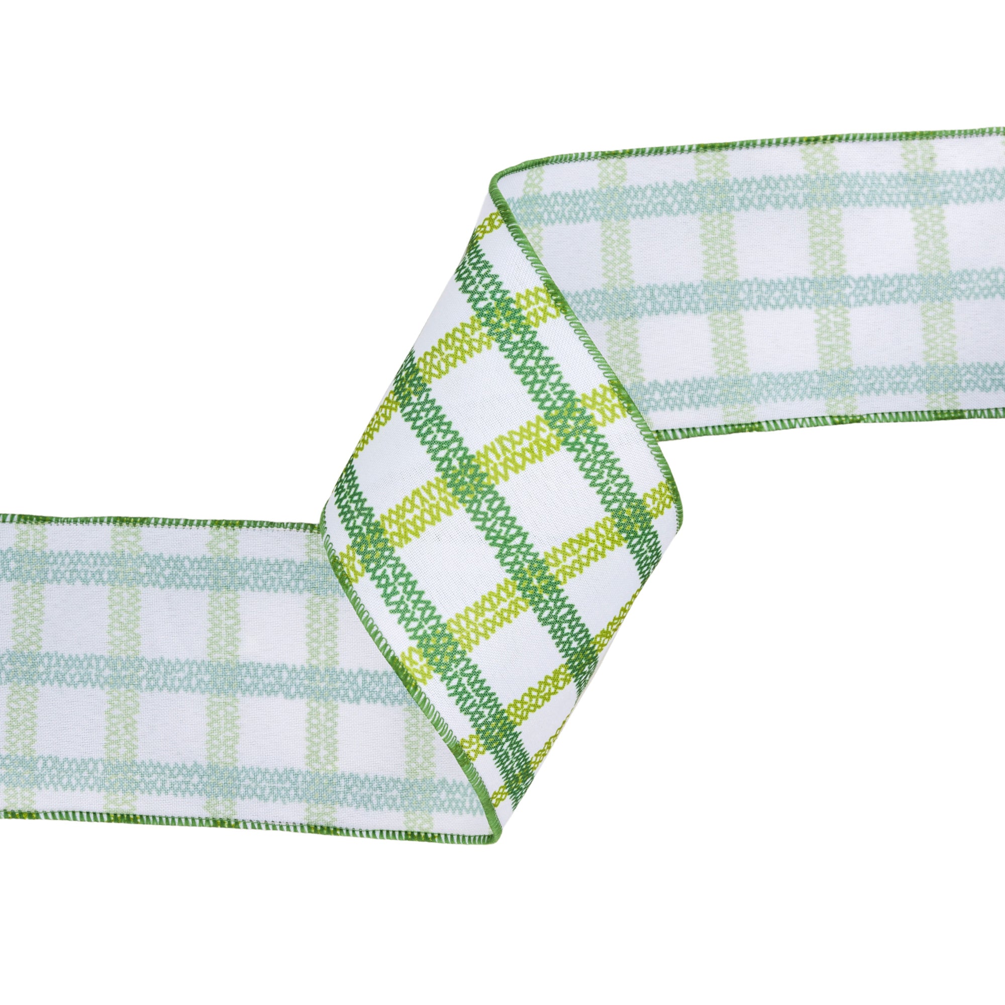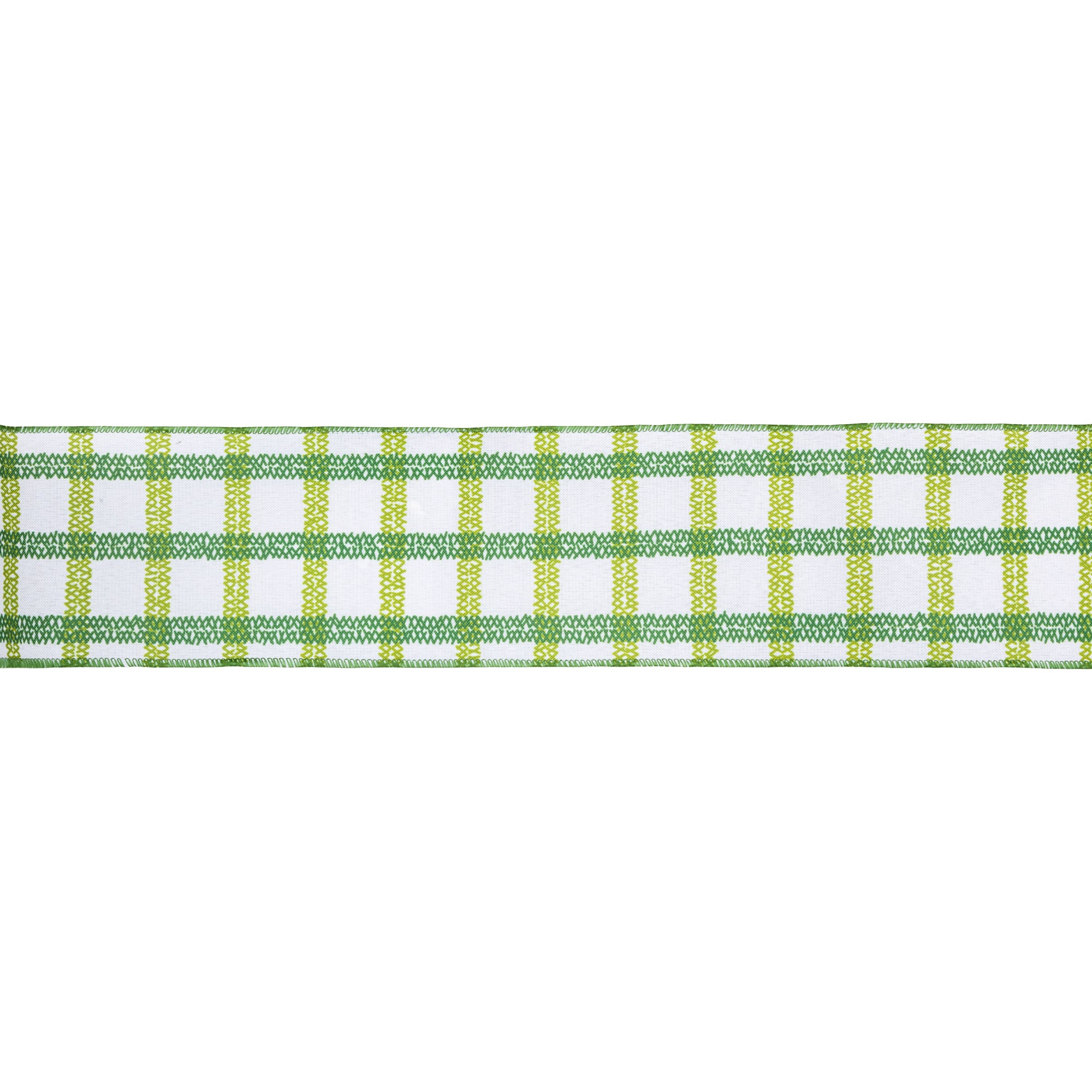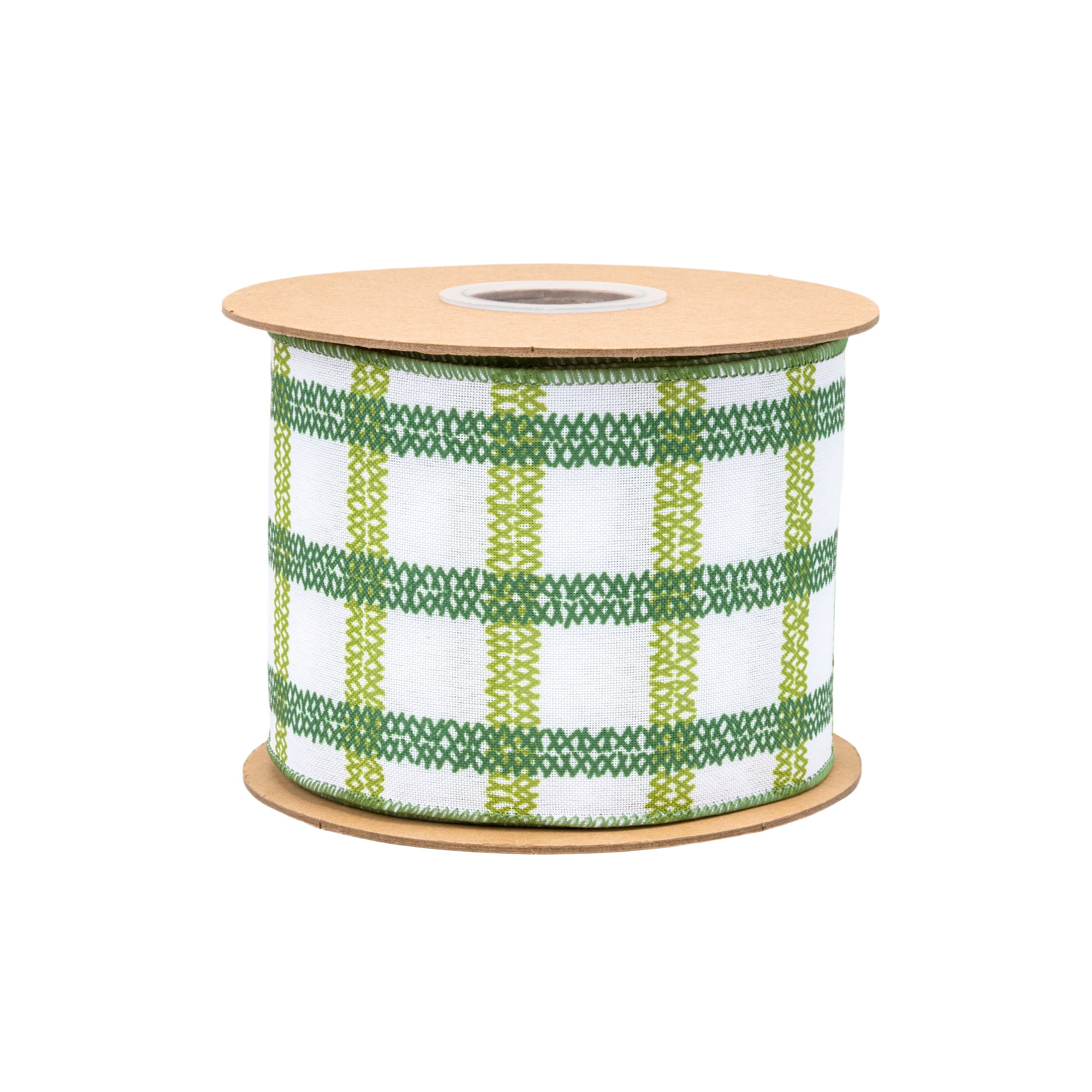 4" Wired Ribbon | Green Grid on White Linen 10 Yard Roll