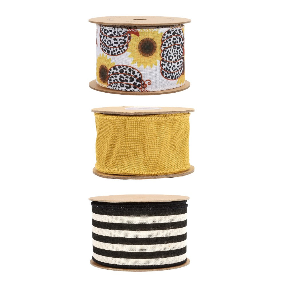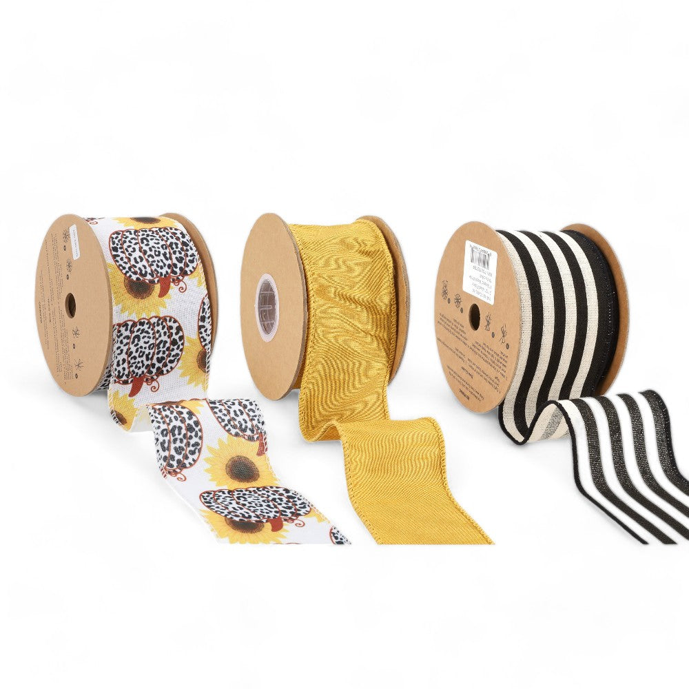 Pumpkin Stripe Wired Ribbon Bundle | Yellow/Black/White | 3 Rolls/30 Yards Total