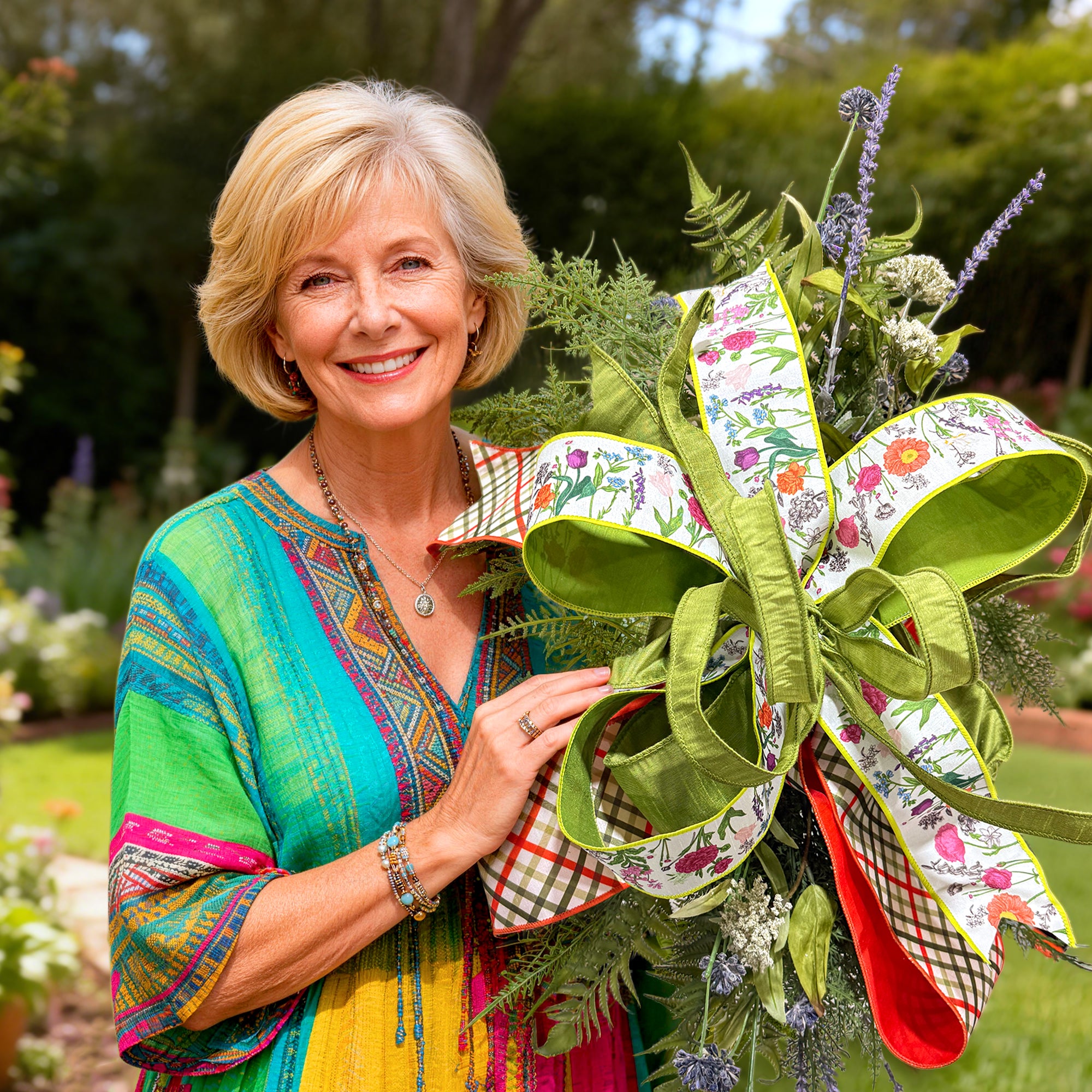 Spring Day Floral Stems with Garden Bias Plaid Ribbon Bundle 4 Rolls |40 Yards