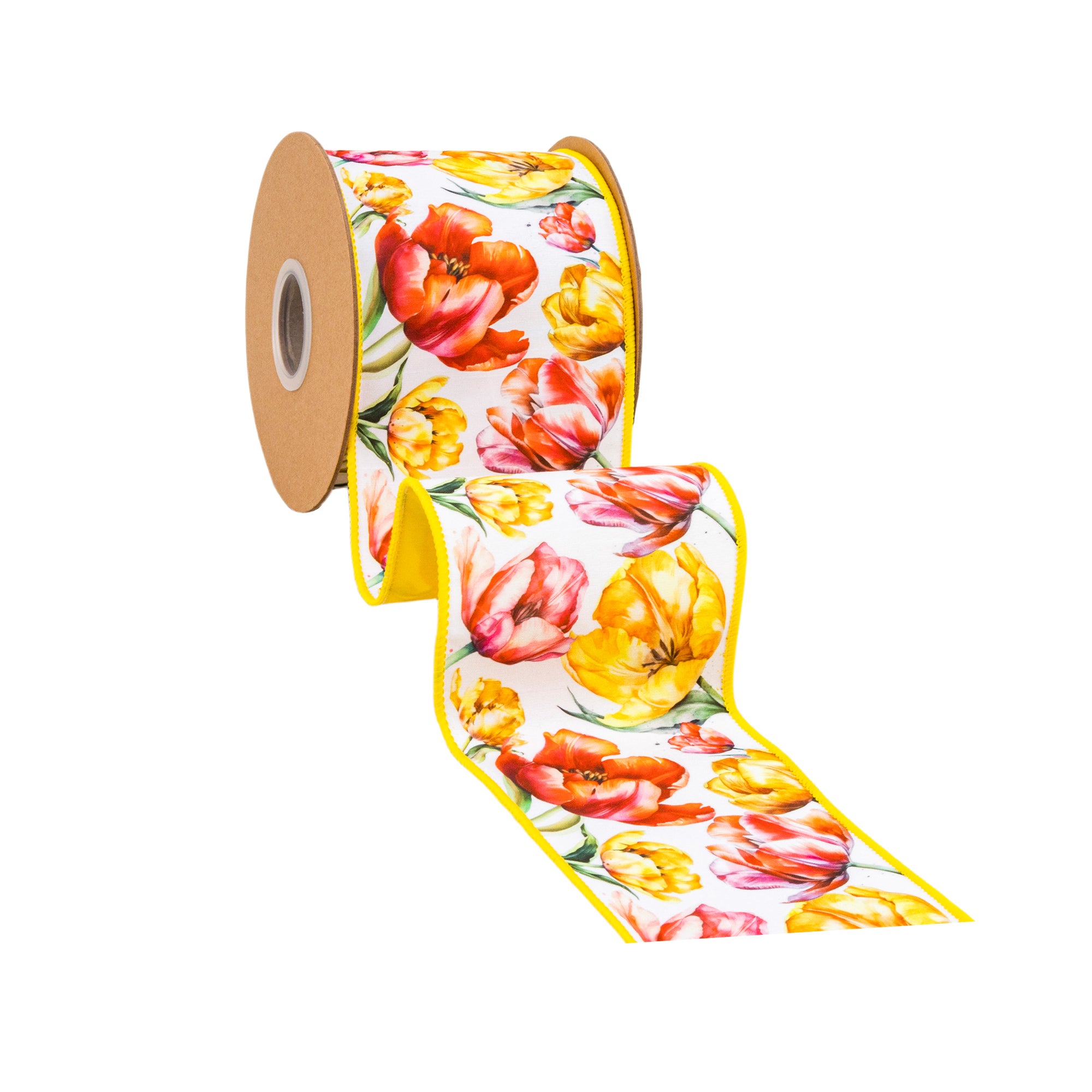 Spring Day Yellow and Pink Tulips with Green Herb Ribbon Bundle 3 Rolls |30 Yards